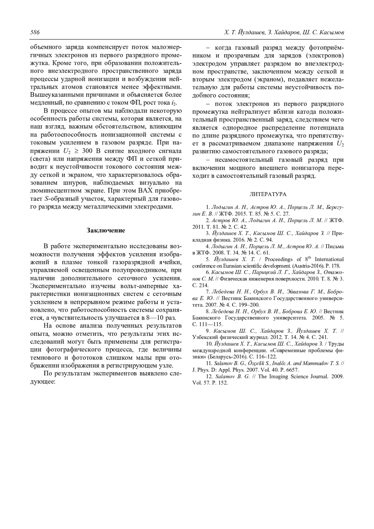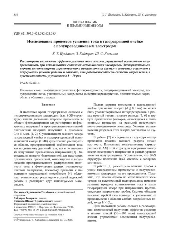 Йулдашев Х. Т., Хайдаров З., Касымов Ш. С. Исследование процессов усиления тока в газоразрядной ячейке с полупроводниковым электродом 580