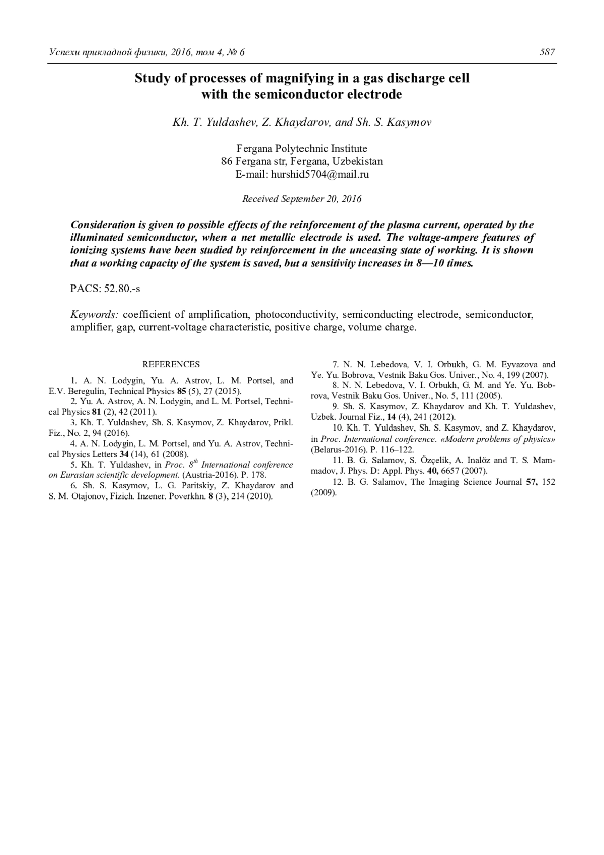 3. Йулдашев Х. Т., Касымов Ш. С., Хайдаров З. // Прикладная физика. 2016. № 2. С. 94. EDN: VWYYIZ