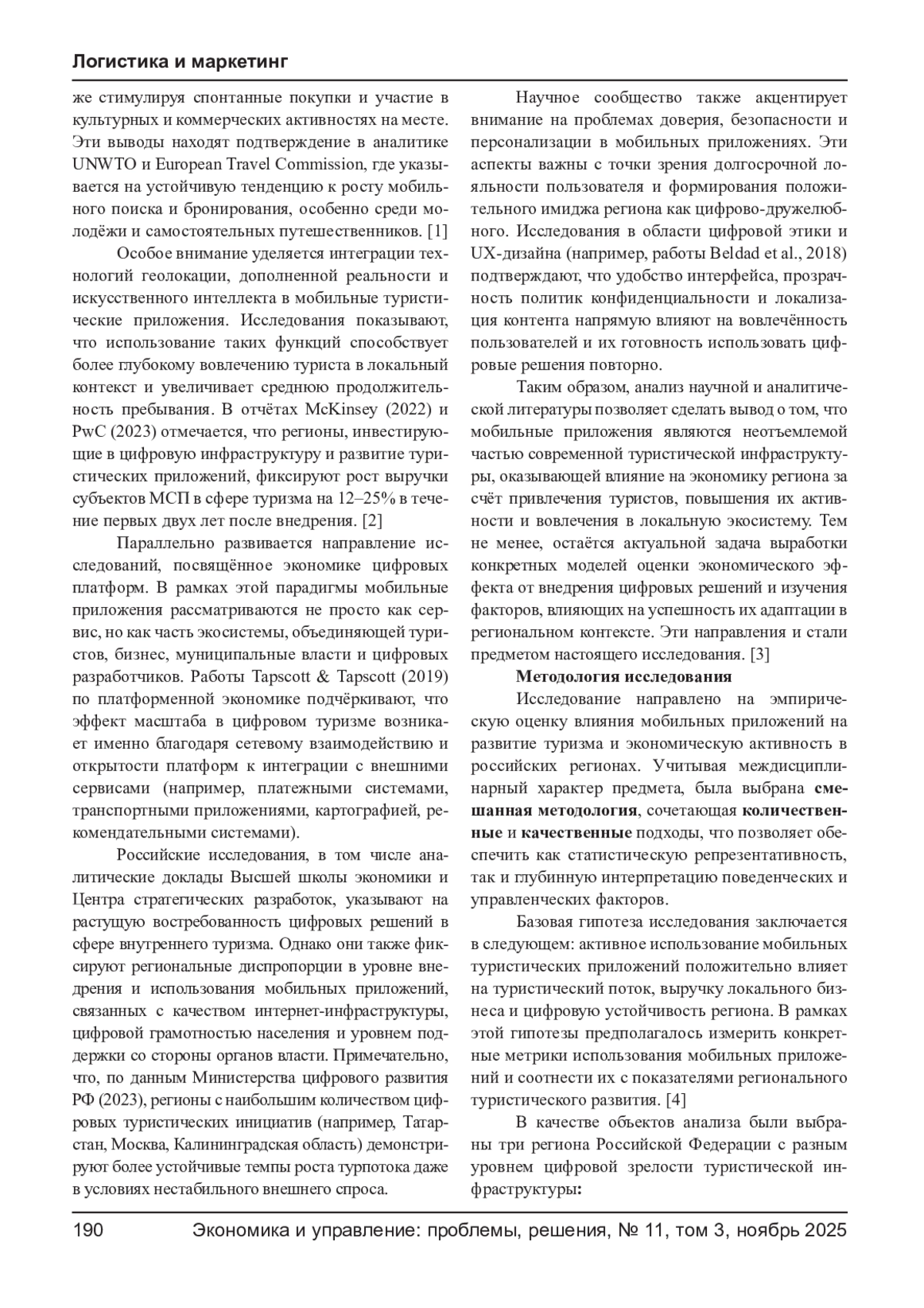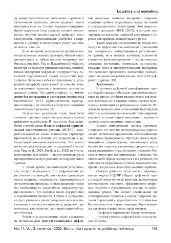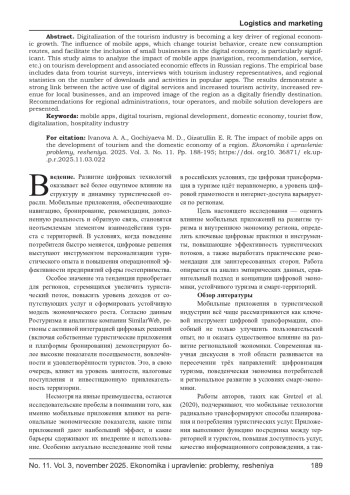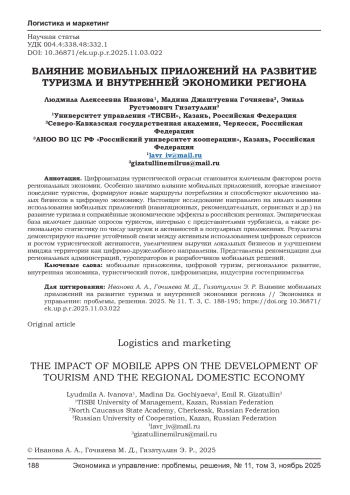 Цифровизация туристической отрасли становится ключевым фактором роста региональных экономик. Особенно значимо влияние мобильных приложений, которые изменяют поведение туристов, формируют новые маршруты потребления и способствуют включению малых бизнесов в цифровую экономику. Настоящее исследование направлено на анализ влияния использования мобильных приложений (навигационных, рекомендательных, сервисных и др.) на развитие туризма и сопряжённые экономические эффекты в российских регионах. Эмпирическая база включает данные опросов туристов, интервью с представителями турбизнеса, а также региональную статистику по числу загрузок и активностей в популярных приложениях. Результаты демонстрируют наличие устойчивой связи между активным использованием цифровых сервисов и ростом туристической активности, увеличением выручки локальных бизнесов и улучшением имиджа территории как цифрово-дружелюбного направления. Представлены рекомендации для региональных администраций, туроператоров и разработчиков мобильных решений.