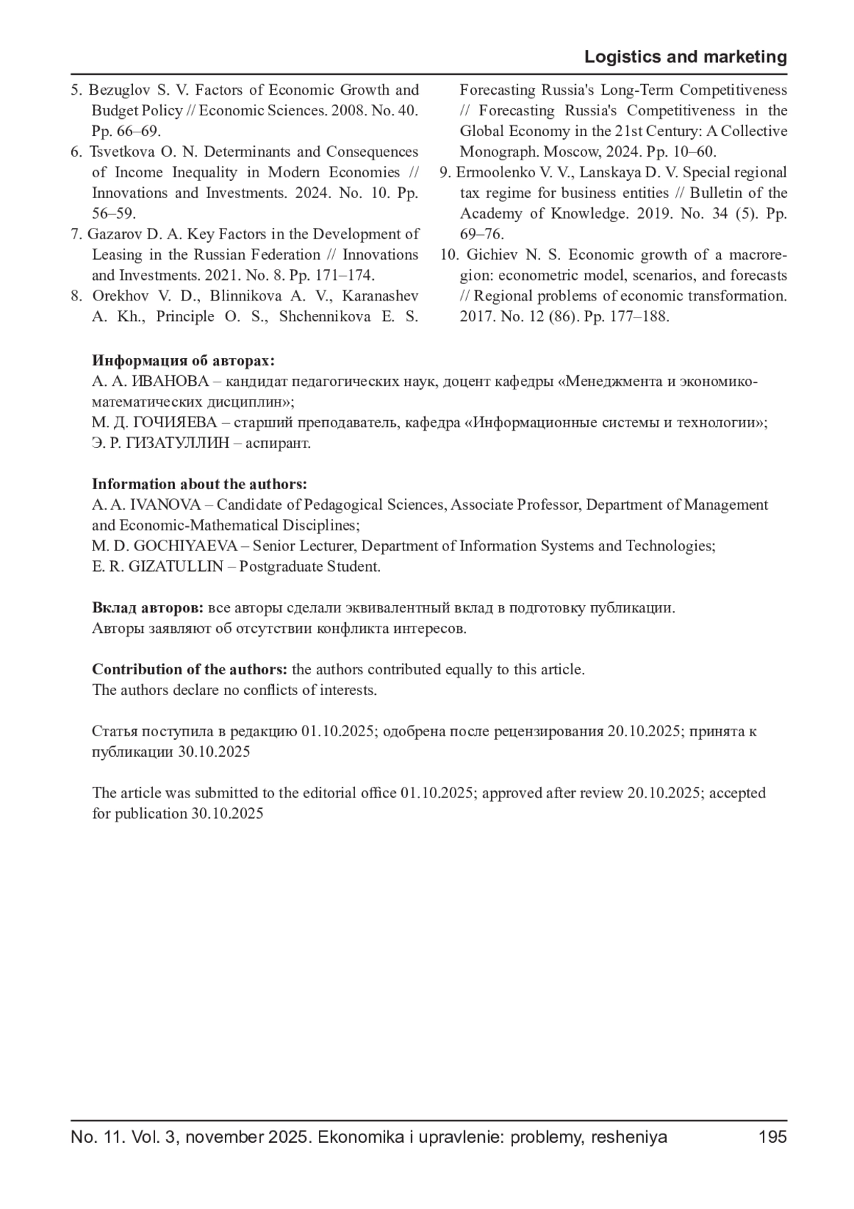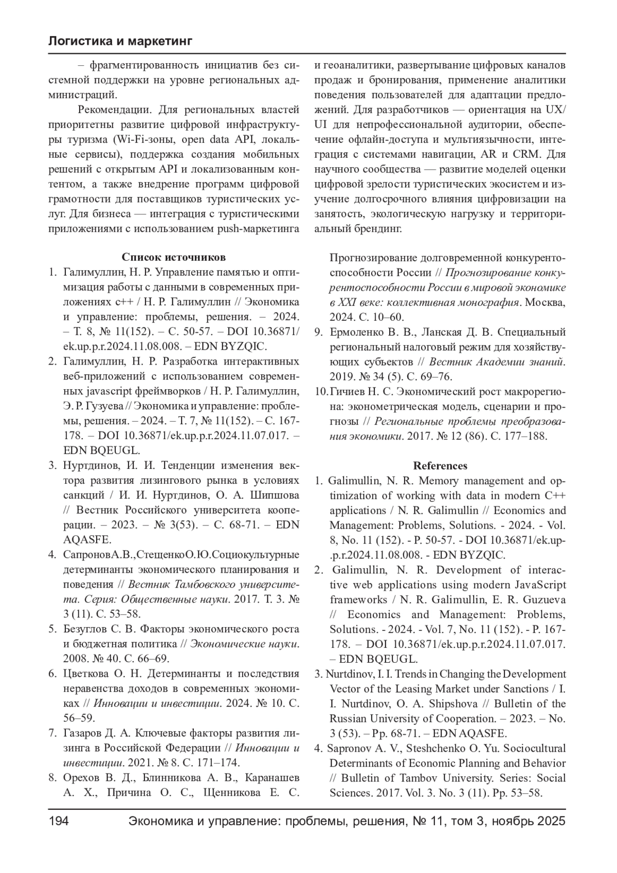 10. Гичиев Н. С. Экономический рост макрорегиона: эконометрическая модель, сценарии и прогнозы // Региональные проблемы преобразования экономики. 2017. № 12 (86). С. 177-188. EDN: YXCRBN