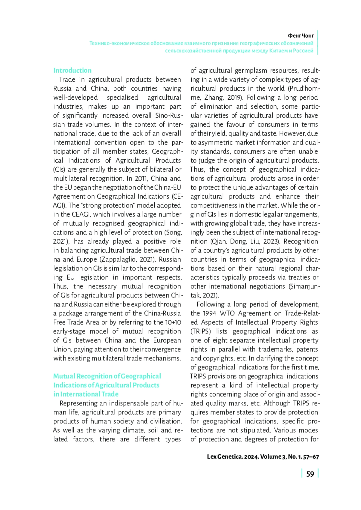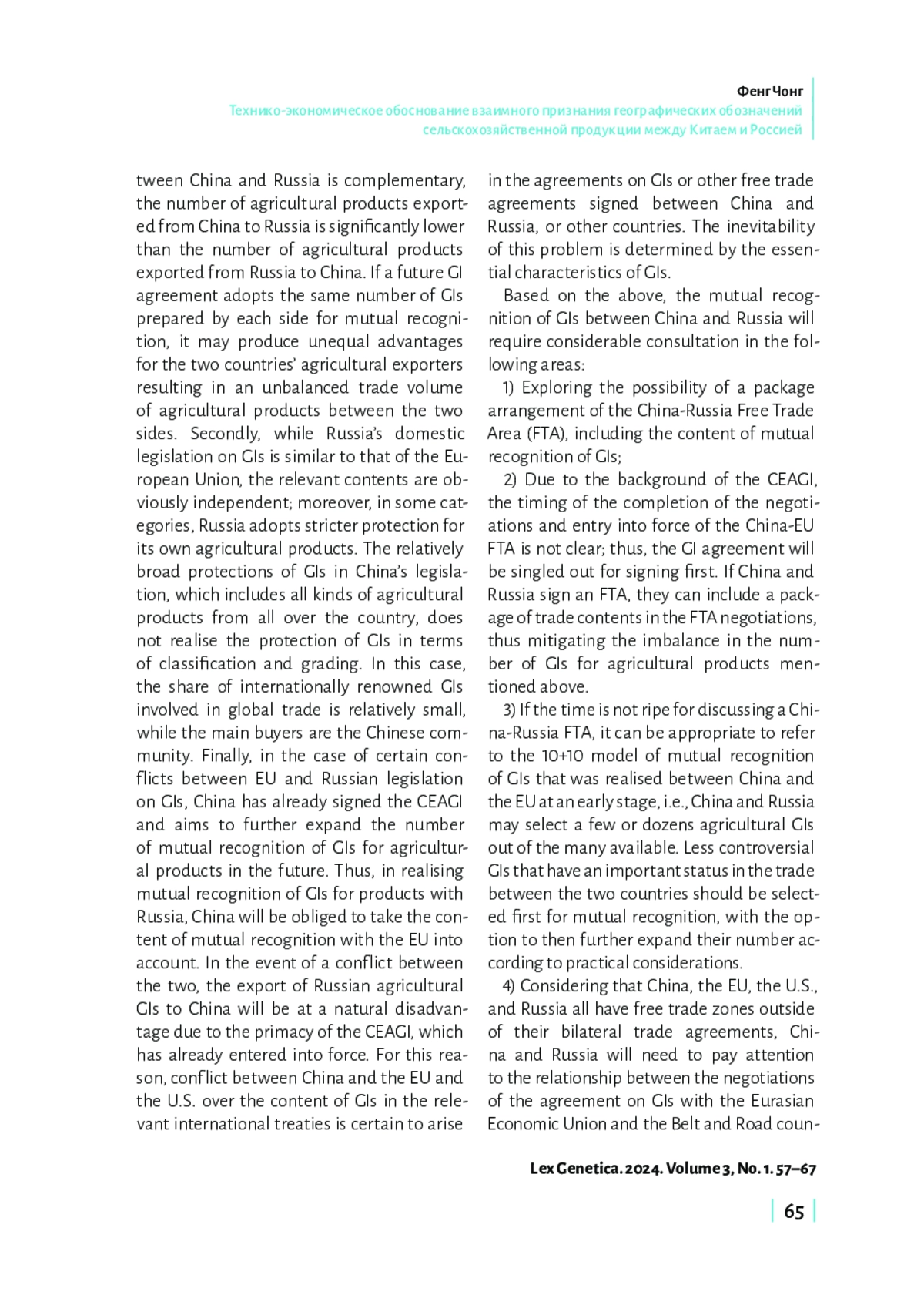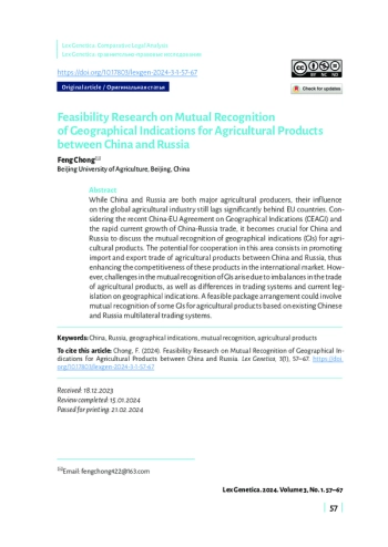 Китай и Россия являются крупными производителями разнообразной сельскохозяйственной продукции. Однако их глобальное влияние на сельскохозяйственную отрасль по-прежнему существенно отстает от стран ЕС. Учитывая соглашение между Китаем и ЕС о географических обозначениях и быстрый рост китайско-российской торговли, для Китая и России крайне важно обсудить взаимное признание географических обозначений для сельскохозяйственной продукции. Потенциальное сотрудничество в этой области направлено на содействие импорту и экспорту сельскохозяйственной продукции между Китаем и Россией, повышение конкурентоспособности этой продукции на международном рынке. Однако нарушение баланса между импортом и экспортом сельскохозяйственной продукции, а также различия в торговых системах и законодательстве о географических обозначениях сделают взаимное признание географических обозначений более сложным. Китай и Россия могли бы рассмотреть «пакетные договоренности», основанные на их собственных многосторонних торговых системах, начиная с взаимного признания некоторых географических обозначений для сельскохозяйственных продуктов.