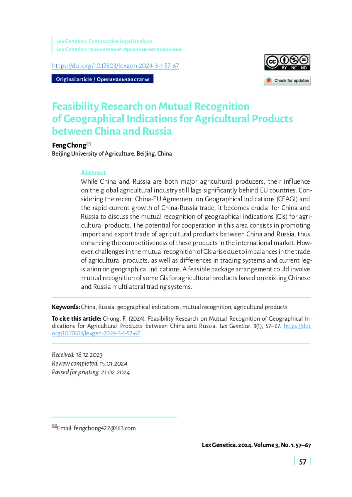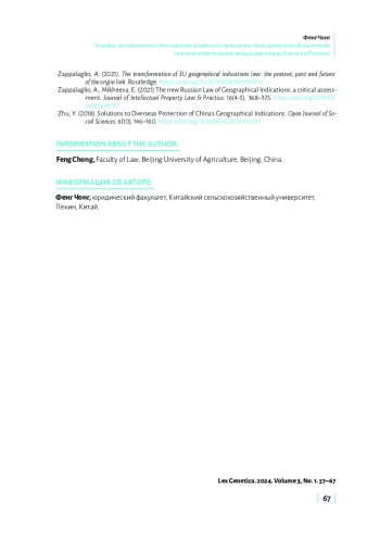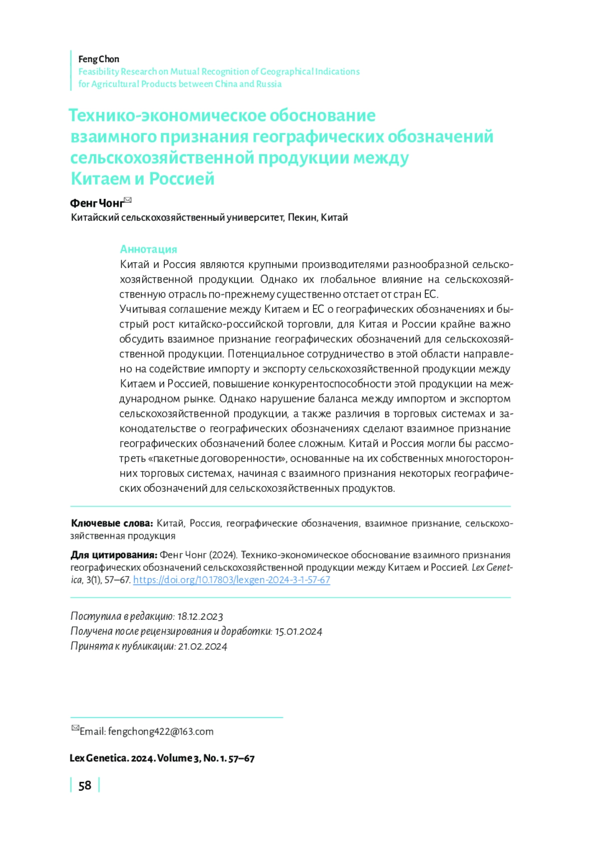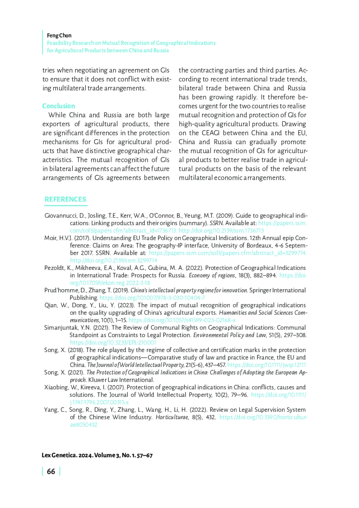 Китай и Россия являются крупными производителями разнообразной сельскохозяйственной продукции. Однако их глобальное влияние на сельскохозяйственную отрасль по-прежнему существенно отстает от стран ЕС. Учитывая соглашение между Китаем и ЕС о географических обозначениях и быстрый рост китайско-российской торговли, для Китая и России крайне важно обсудить взаимное признание географических обозначений для сельскохозяйственной продукции. Потенциальное сотрудничество в этой области направлено на содействие импорту и экспорту сельскохозяйственной продукции между Китаем и Россией, повышение конкурентоспособности этой продукции на международном рынке. Однако нарушение баланса между импортом и экспортом сельскохозяйственной продукции, а также различия в торговых системах и законодательстве о географических обозначениях сделают взаимное признание географических обозначений более сложным. Китай и Россия могли бы рассмотреть «пакетные договоренности», основанные на их собственных многосторонних торговых системах, начиная с взаимного признания некоторых географических обозначений для сельскохозяйственных продуктов.