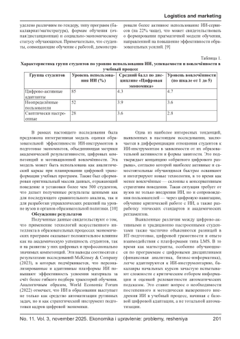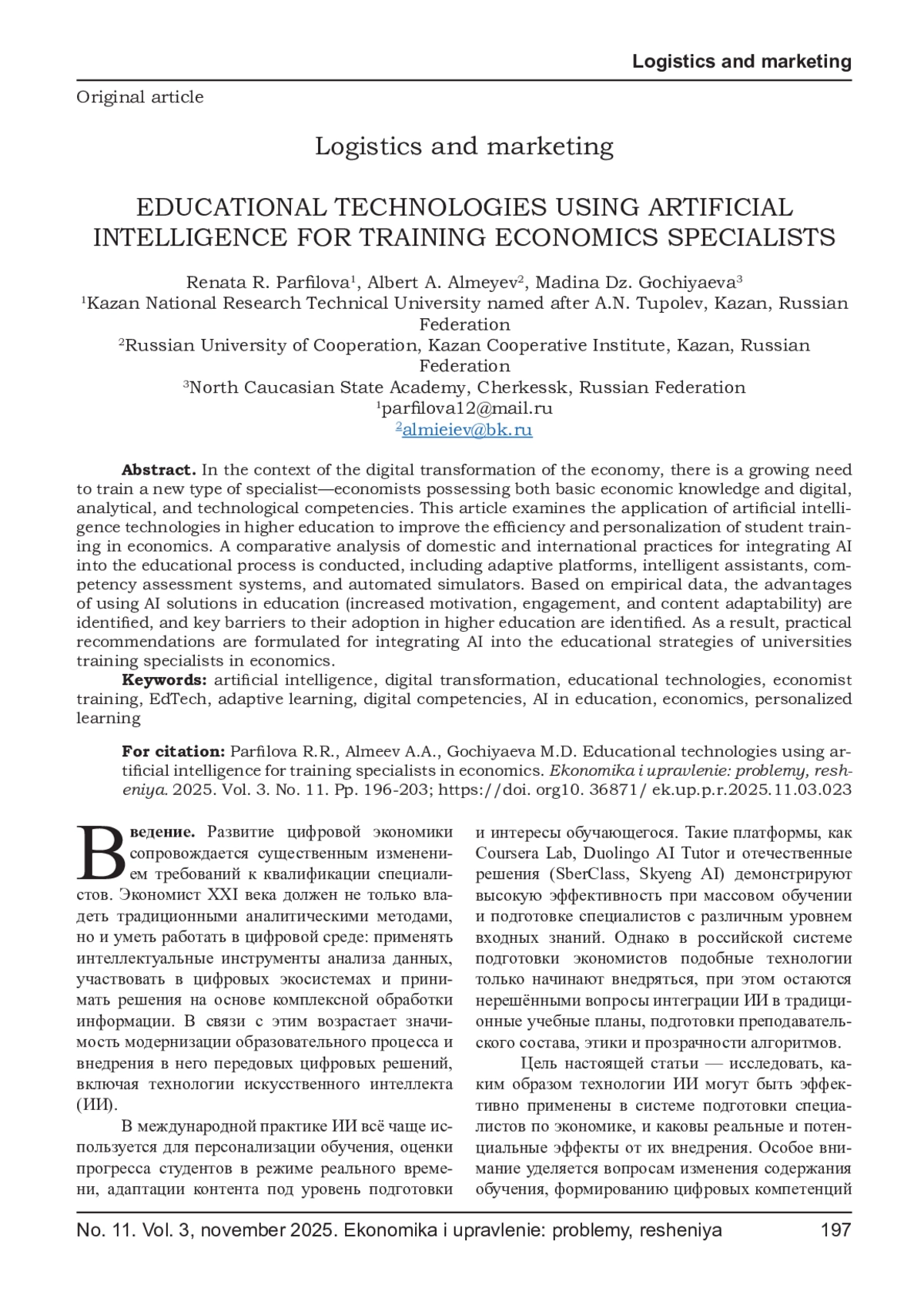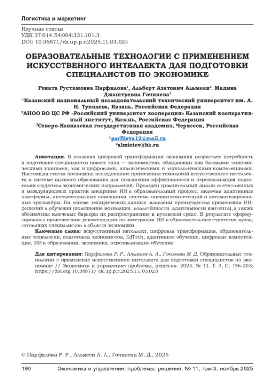 В условиях цифровой трансформации экономики возрастает потребность в подготовке специалистов нового типа - экономистов, обладающих как базовыми экономическими знаниями, так и цифровыми, аналитическими и технологическими компетенциями. Настоящая статья посвящена исследованию применения технологий искусственного интеллекта в системе высшего образования для повышения эффективности и персонализации подготовки студентов экономических направлений. Проведён сравнительный анализ отечественных и международных практик внедрения ИИ в образовательный процесс, включая адаптивные платформы, интеллектуальные помощники, системы оценки компетенций и автоматизированные тренажёры. На основе эмпирических данных выявлены преимущества применения ИИрешений в обучении (повышение мотивации, вовлечённости, адаптивности контента), а также обозначены ключевые барьеры их распространения в вузовской среде. В результате сформулированы практические рекомендации по интеграции ИИ в образовательные стратегии вузов, готовящих специалистов в области экономики.