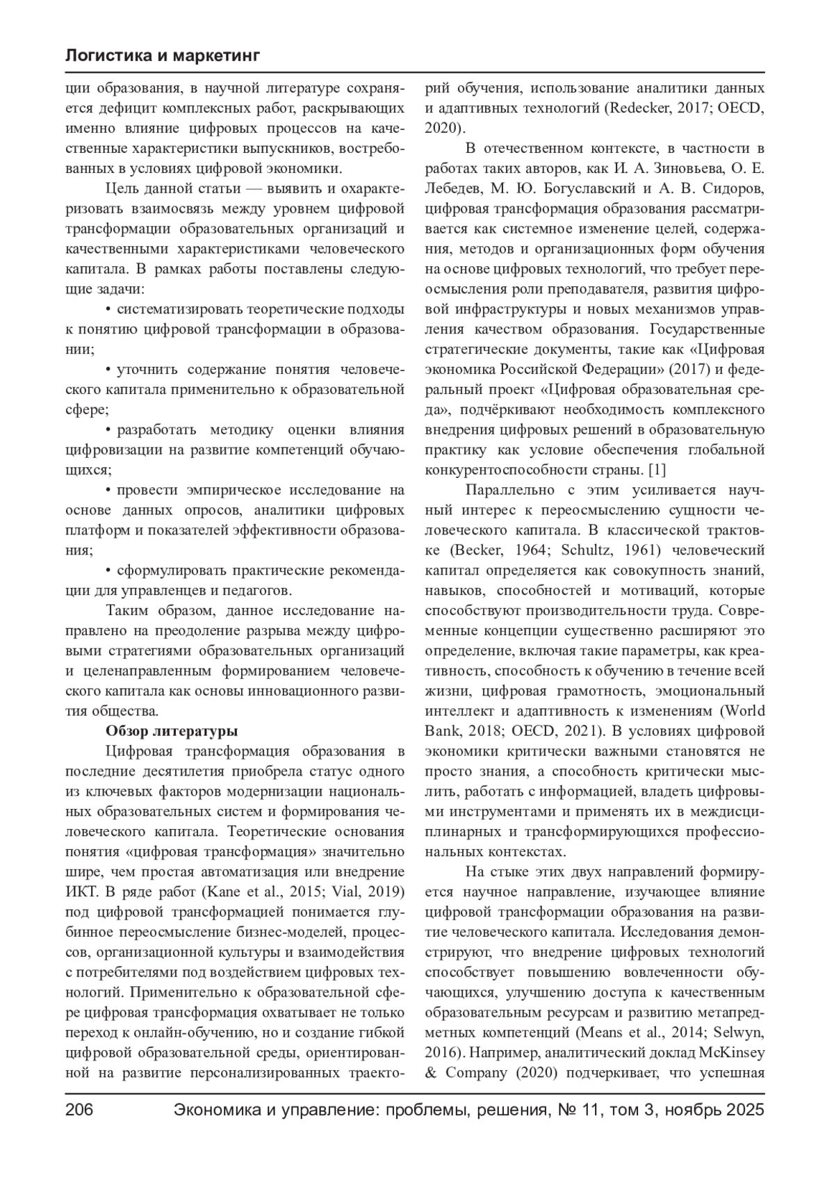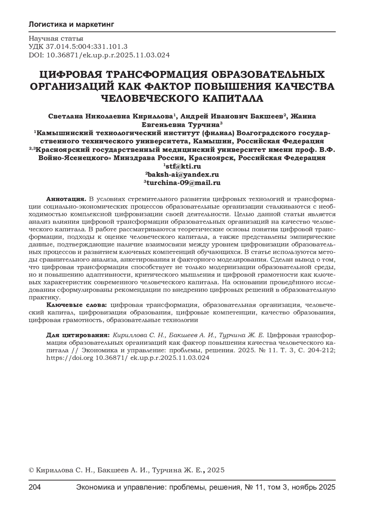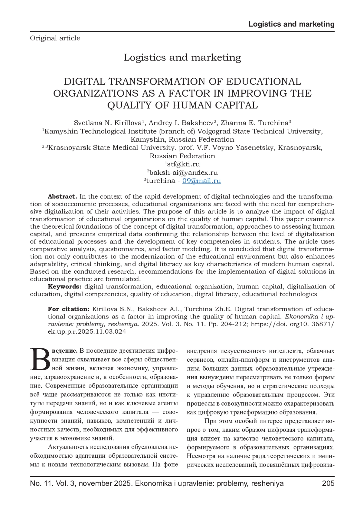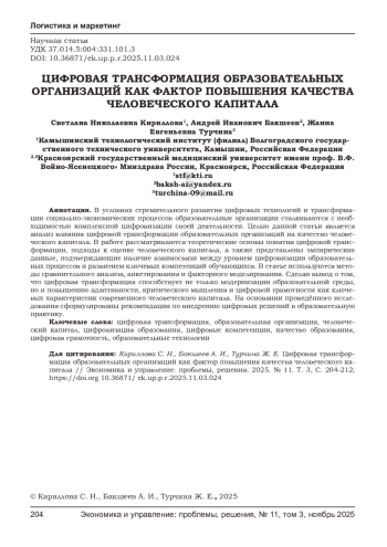 Целью данной статьи является анализ влияния цифровой трансформации образовательных организаций на качество человеческого капитала. В работе рассматриваются теоретические основы понятия цифровой трансформации, подходы к оценке человеческого капитала, а также представлены эмпирические данные, подтверждающие наличие взаимосвязи между уровнем цифровизации образовательных процессов и развитием ключевых компетенций обучающихся. В статье используются методы сравнительного анализа, анкетирования и факторного моделирования. Сделан вывод о том, что цифровая трансформация способствует не только модернизации образовательной среды, но и повышению адаптивности, критического мышления и цифровой грамотности как ключевых характеристик современного человеческого капитала. На основании проведённого исследования сформулированы рекомендации по внедрению цифровых решений в образовательную практику.