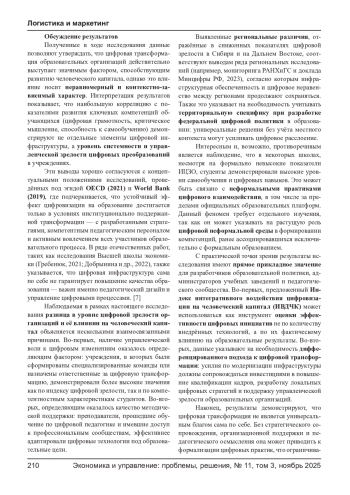 Целью настоящего исследования является анализ влияния цифровых технологий на процессы инновационного развития экономики в условиях цифровой трансформации. В статье рассмотрены современные подходы к оценке цифровой зрелости экономических систем, выявлены взаимосвязи между уровнем цифровизации и интенсивностью инновационных процессов. Проведён анализ эмпирических данных по странам и отраслям, который подтвердил, что интеграция таких технологий, как искусственный интеллект, большие данные и интернет вещей, способствует ускорению инновационной активности, снижению транзакционных издержек и росту экономической эффективности. Особое внимание уделено роли цифровой инфраструктуры как системообразующего элемента инновационной экономики. В результате выявлены как позитивные эффекты цифровизации, так и вызовы, связанные с неравномерностью технологического развития, цифровым неравенством и институциональными барьерами. На основе полученных данных сформулированы предложения по усилению синергии между государственной политикой, цифровой трансформацией и стратегиями инновационного роста.