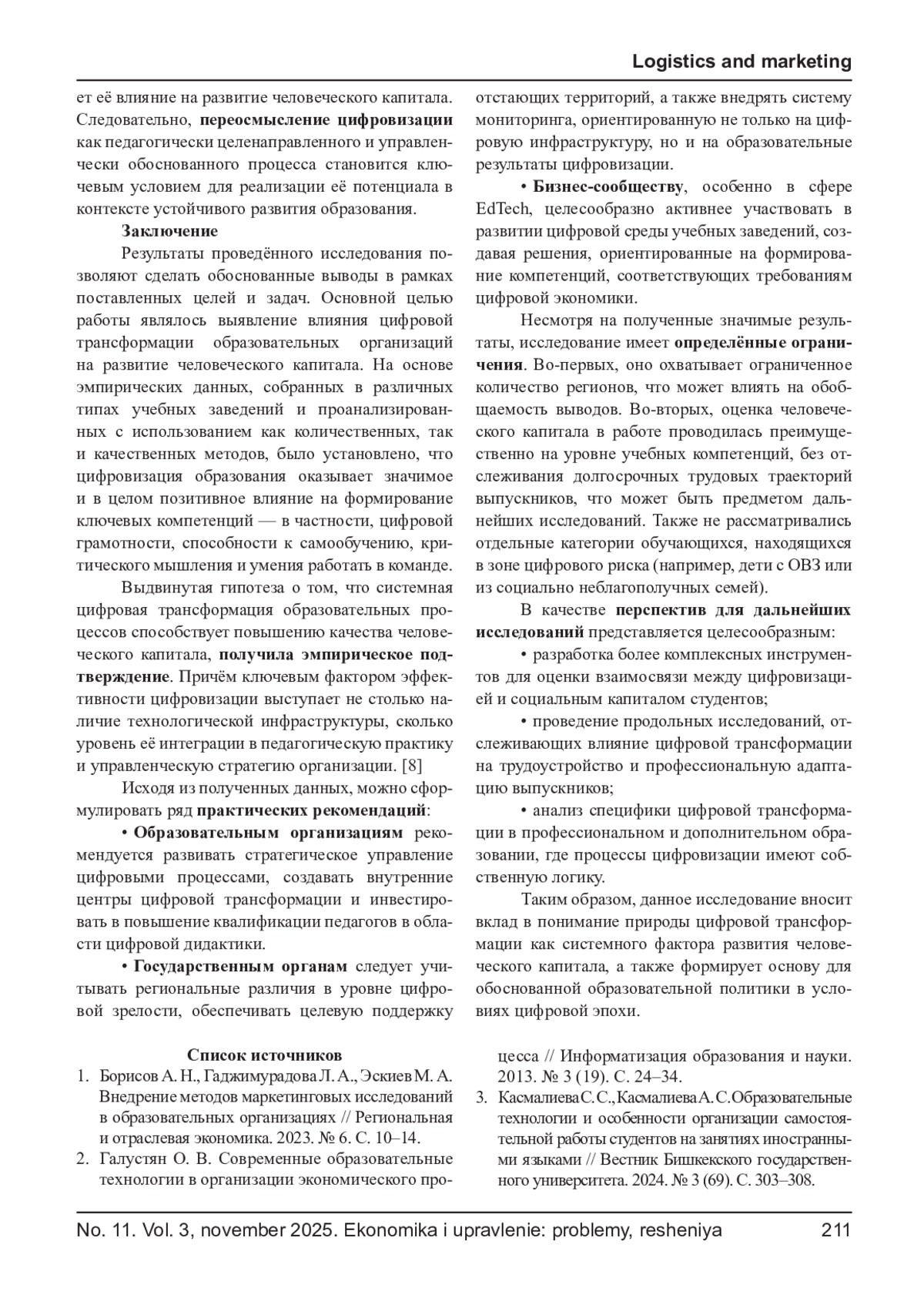 1. Борисов А. Н., Гаджимурадова Л. А., Эскиев М. А. Внедрение методов маркетинговых исследований в образовательных организациях // Региональная и отраслевая экономика. 2023. № 6. С. 10-14. EDN: AQKELW