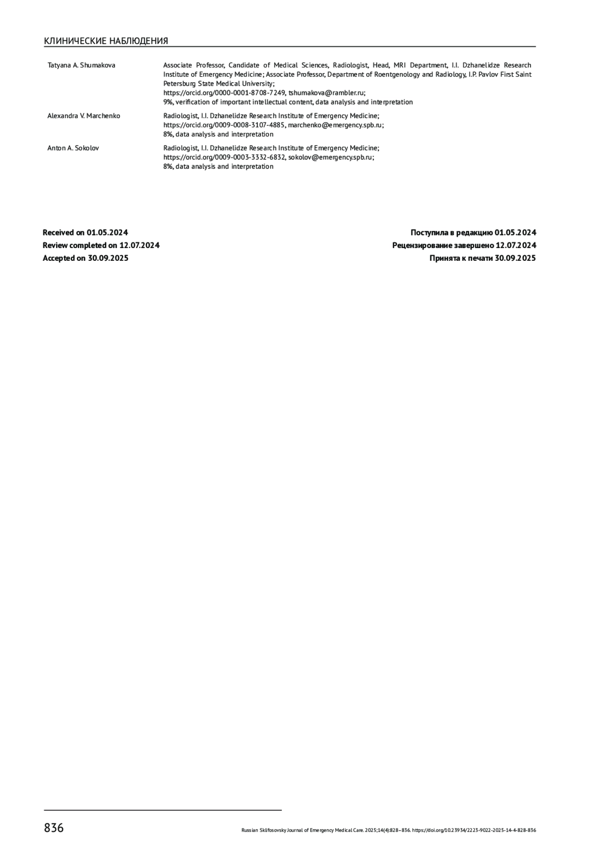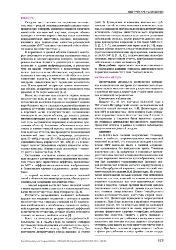 Формирование нейротомографической картины синдрома цитотоксического поражения мозолистого тела по данным магнитно-резонансной томографии у пациента со сложным анамнезом и синдромом позиционного сдавления может быть обратимым, предполагает необходимость проведения детального клинико-лабораторного обоснования патогенеза выявленных изменений и своевременного проведения полноценного комплекса инфузионно-детоксикационной и нейрометаболической терапии.