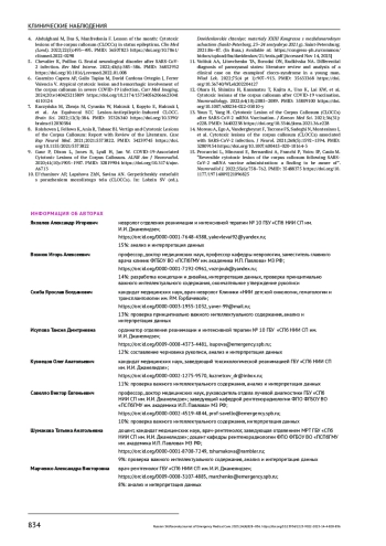 10. Ельчанинов А.П., Лапшова Ж.Н., Савина А.Н. Герпетический энцефалит с поражением мозолистого тела (CLOCCs). В сб.: Лобзин С. В. (ред.). Давиденковские чтения: материалы XXIII Конгресса с международным участием (Санкт-Петербург, 23-24 сентября 2021 г). Санкт-Петербург; 2021. с. 86-87. URL: https://congress-ph.ru/common/htdocs/upload/fm/davidenkov/21/tezis.pdf [Дата обращения 14 ноября 2025 г.].