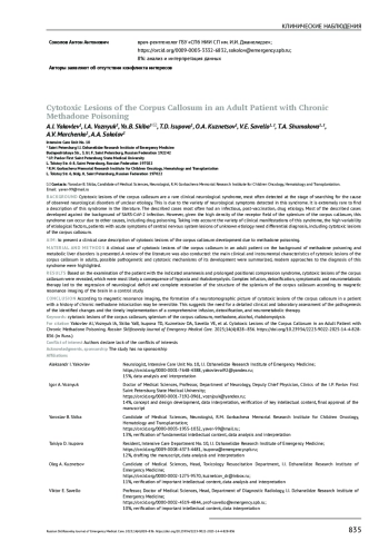 Синдром цитотоксического поражения мозолистого тела - редкий клинико-неврологический синдром, чаще всего выявляемый на этапе поиска причины, наблюдаемых неврологических нарушений неясной этиологии. Это объясняется разнообразием неврологических симптомов, выявляемых при этом синдроме. Крайне редко можно встретить описание этого синдрома в литературе. Описанные случаи чаще всего имели инфекционную, поствакцинальную, лекарственно-индуцированную этиологию. Большая часть описанных случаев развивалась на фоне инфекции SARS-CoV-2. Однако учитывая высокую плотность рецепторного поля валика мозолистого тела, данный синдром может возникать на фоне иных причин, в том числе отравления наркотическими веществами. Принимая во внимание разнообразие клинических проявлений данного синдрома, высокую вариабельность этиологических факторов, пациенты с острыми симптомами поражения центральной нервной системы неизвестной этиологии требуют проведения дифференциальной диагностики, в том числе с синдромом цитотоксического повреждения мозолистого тела.