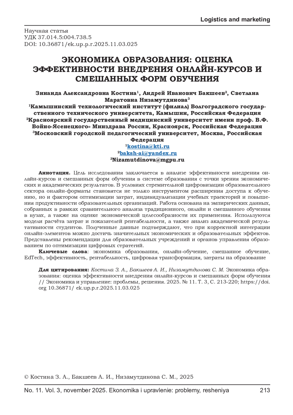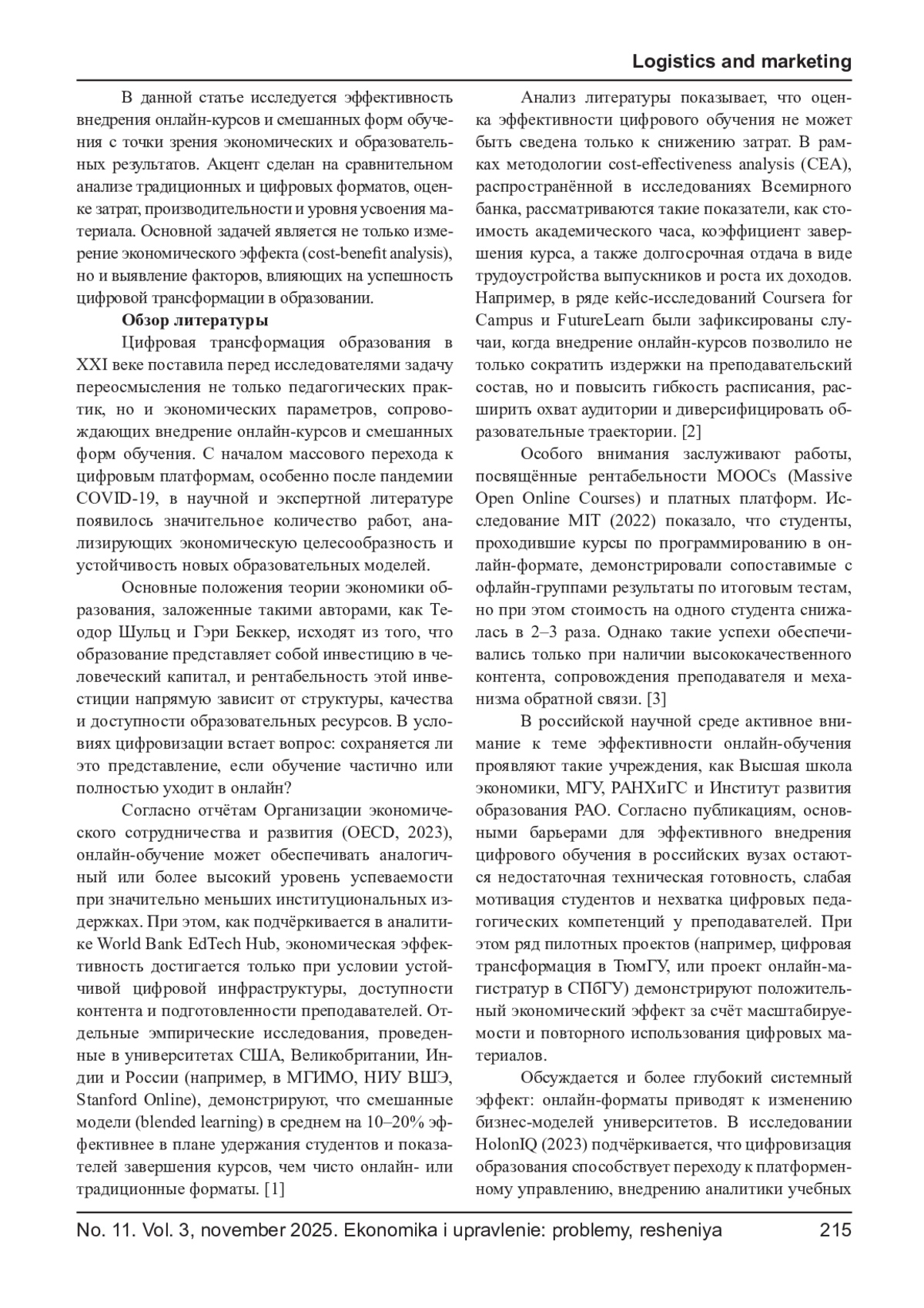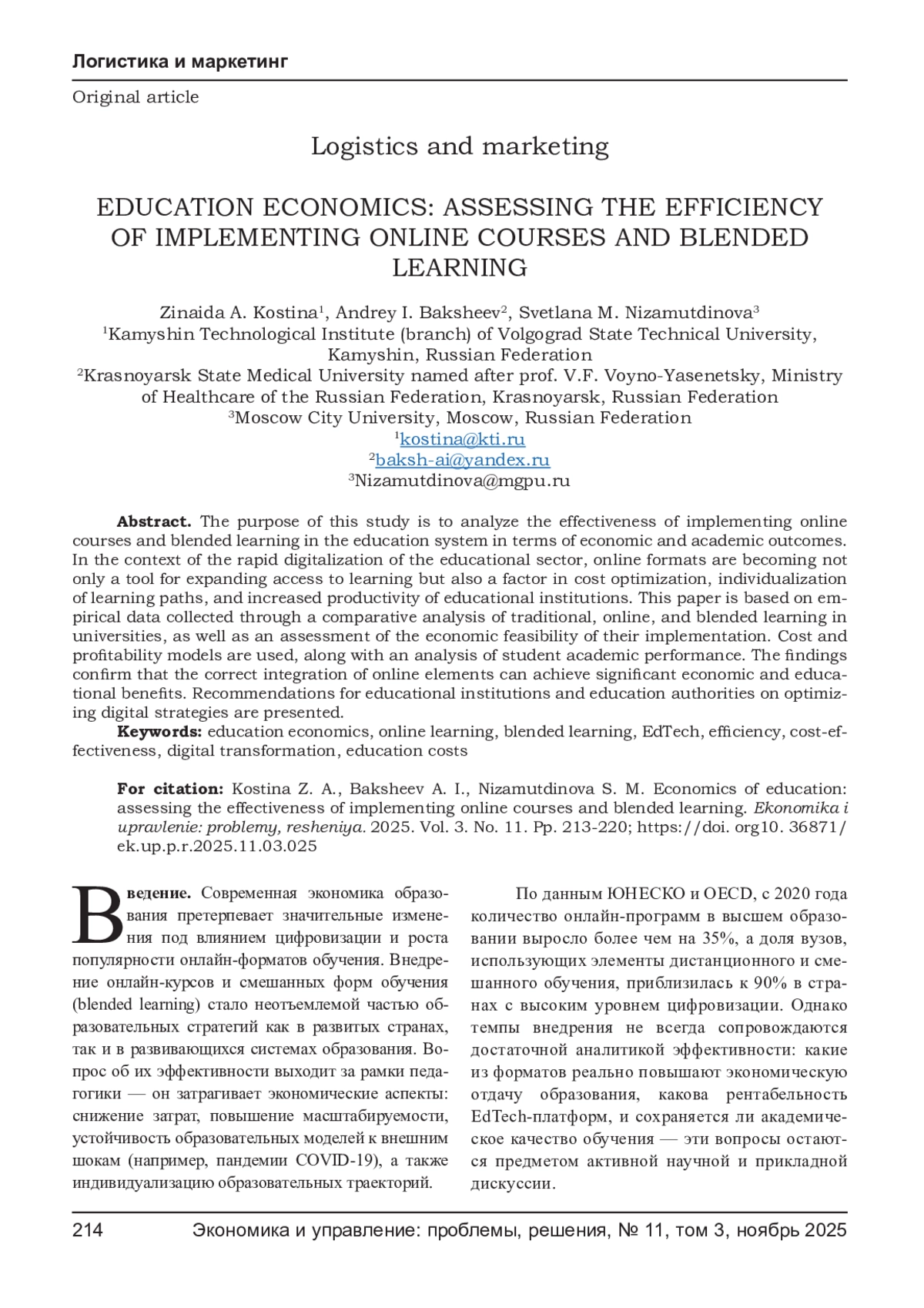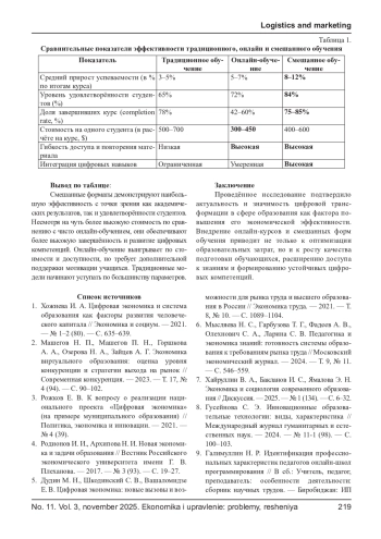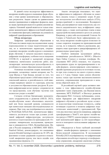 Цель исследования заключается в анализе эффективности внедрения онлайн-курсов и смешанных форм обучения в системе образования с точки зрения экономических и академических результатов. В условиях стремительной цифровизации образовательного сектора онлайн-форматы становятся не только инструментом расширения доступа к обучению, но и фактором оптимизации затрат, индивидуализации учебных траекторий и повышения продуктивности образовательных организаций. Работа основана на эмпирических данных, собранных в рамках сравнительного анализа традиционного, онлайн и смешанного обучения в вузах, а также на оценке экономической целесообразности их применения. Используются модели расчёта затрат и показателей рентабельности, а также анализ академической результативности студентов. Полученные данные подтверждают, что при корректной интеграции онлайн-элементов можно достичь значительных экономических и образовательных эффектов. Представлены рекомендации для образовательных учреждений и органов управления образованием по оптимизации цифровых стратегий.