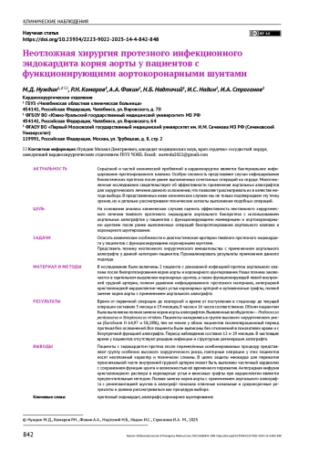 Описать клинические особенности и диагностические критерии тяжёлого протезного эндокардита у пациентов с функционирующими коронарными шунтами. Представить технику неотложного хирургического вмешательства с применением аортального аллографта у данной категории пациентов. Проанализировать результаты применения данного подхода.