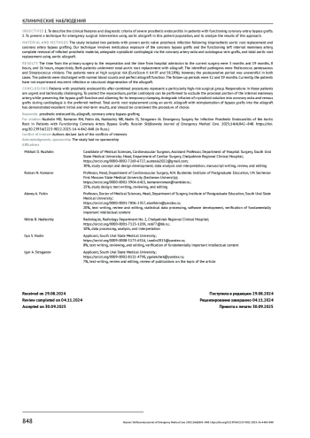 Хирургическое лечение протезного инфекционного эндокардита (ПИЭ) после протезирования корня аорты представляет собой сложную операцию, для которой могут быть выбраны несколько стратегий, включая замену корня аорты с использованием аллографта [1]. Повторное протезирование корня аорты после ранее выполненных комбинированных процедур, особенно в случае компетентности аортокоронарных шунтов, может оказаться более сложной задачей в отношении хирургической техники и защиты миокарда [2, 3]. Замена корня аорты аллографтом при ПИЭ показывает превосходные клинические результаты с низкой частотой осложнений, что делает его использование обоснованным [4, 5]. Тем не менее технические аспекты замены корня аллографтом при ПИЭ с проходимыми коронарными шунтами не описаны должным образом. В этой серии случаев мы демонстрируем клинические особенности, диагностические данные и наш подход к таким пациентам, которые, как правило, требуют неотложной или экстренной операции.