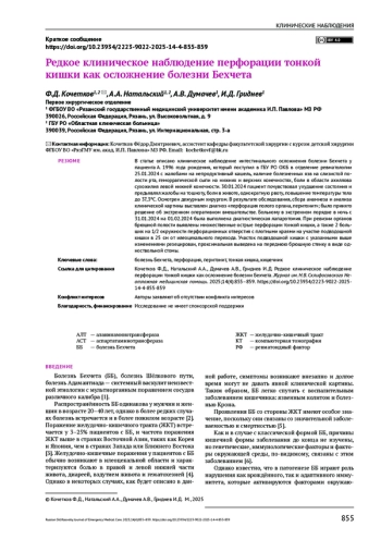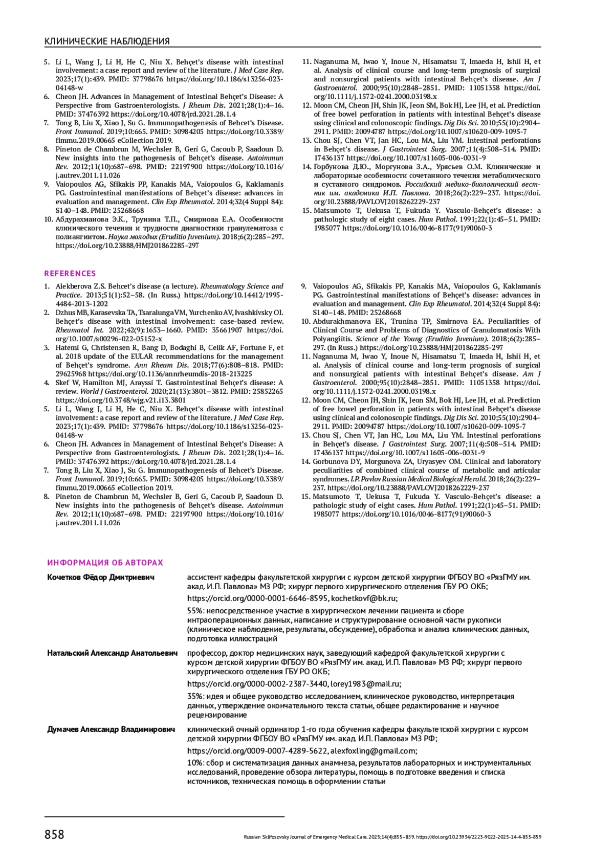 10. Абдурахманова Э.К., Трунина Т.П., Смирнова Е.А. Особенности клинического течения и трудности диагностики гранулематоза с полиангиитом. Наука молодых (Eruditio Juvenium). 2018;6(2):285-297. DOI: 10.23888/HMJ201862285-297 11. Naganuma M, Iwao Y, Inoue N, Hisamatsu T, Imaeda H, Ishii H, et al. Analysis of clinical course and long-term prognosis of surgical and nonsurgical patients with intestinal Behçet’s disease. Am J Gastroenterol. 2000;95(10):2848-2851. PMID: 11051358. DOI: 10.1111/j.1572-0241.2000.03198.x PMID: 11051358