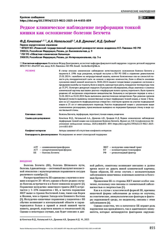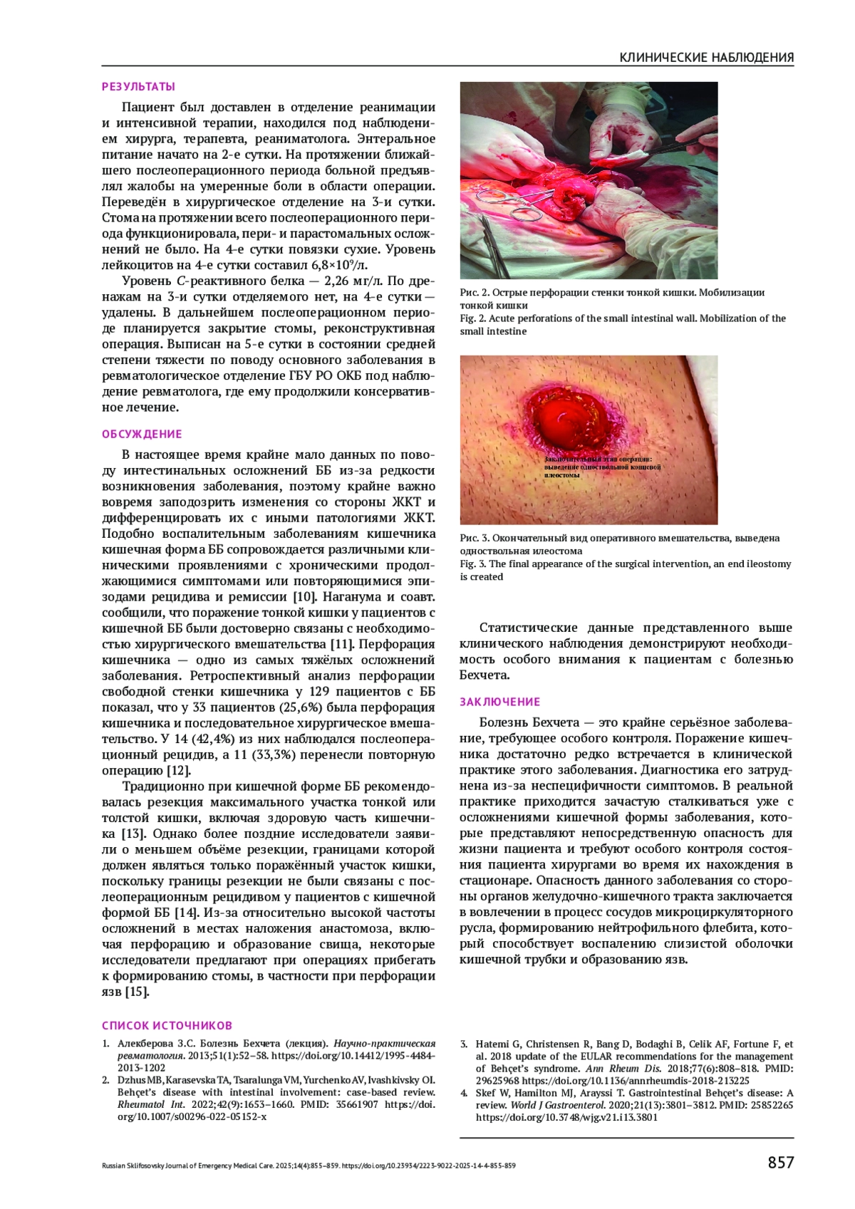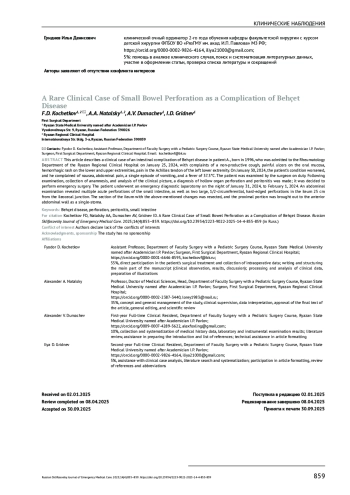 В статье описано клиническое наблюдение интестинального осложнения болезни Бехчета у пациента А. 1996 года рождения, который поступил в ГБУ РО ОКБ в отделение ревматологии 25.01.2024 с жалобами на непродуктивный кашель, наличие болезненных язв на слизистой полости рта, геморрагической сыпи на нижних и верхних конечностях, боли в области ахиллова сухожилия левой нижней конечности. 30.01.2024 пациент почувствовал ухудшение состояния и предъявлял жалобы на тошноту, боли в животе, однократную рвоту, повышение температуры тела до 37,3ºС. Осмотрен дежурным хирургом. В результате обследования, сбора анамнеза и анализа клинической картины выставлен диагноз «перфорация полого органа, перитонит»; было принято решение об экстренном оперативном вмешательстве. Больному в экстренном порядке в ночь с 31.01.2024 на 01.02.2024 была выполнена диагностическая лапаротомия. При ревизии органов брюшной полости выявлены множественные острые перфорации тонкой кишки, а также 2 больших на 1/2 окружности перфорационных отверстия с плотными краями на участке подвздошной кишки в 25 см от илеоцекального перехода. Участок подвздошной кишки с указанными выше изменениями резецирован, проксимальная выведена на переднюю брюшную стенку в виде одноствольной стомы.