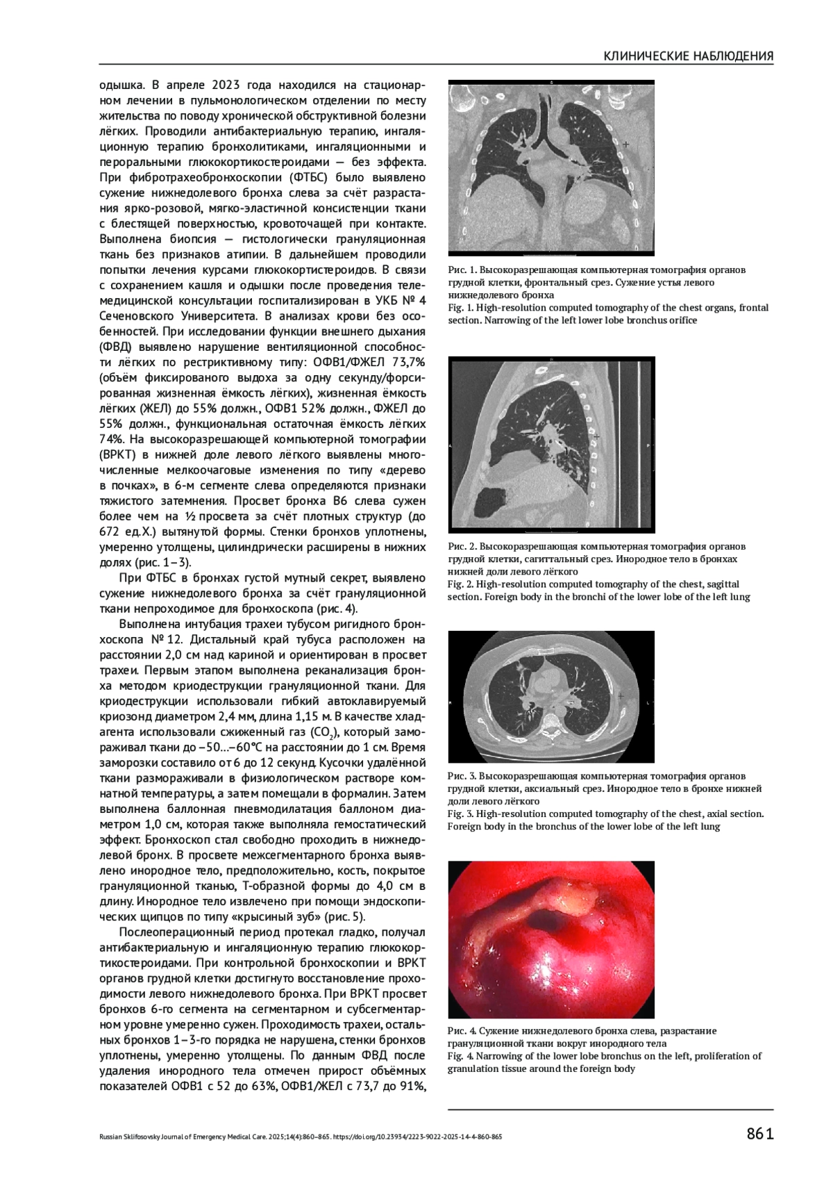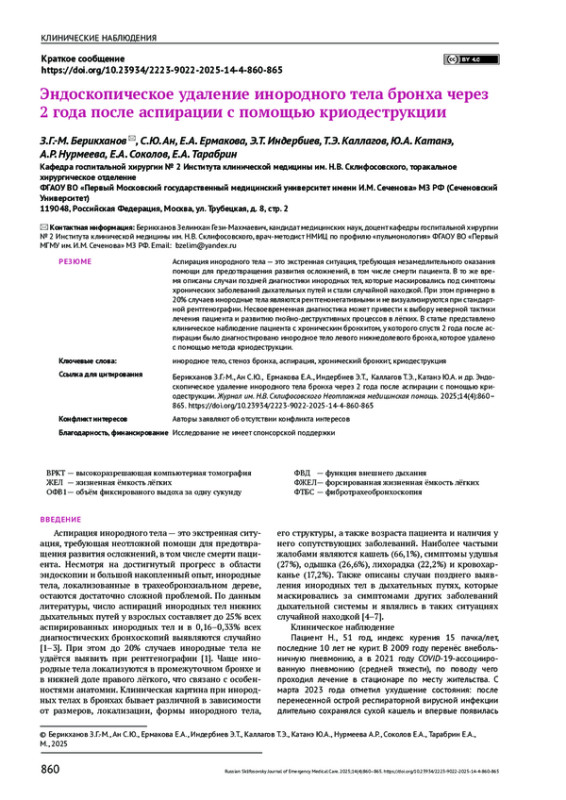 Аспирация инородного тела — это экстренная ситуация, требующая незамедлительного оказания помощи для предотвращения развития осложнений, в том числе смерти пациента. В то же время описаны случаи поздней диагностики инородных тел, которые маскировались под симптомы хронических заболеваний дыхательных путей и стали случайной находкой. При этом примерно в 20% случаев инородные тела являются рентгенонегативными и не визуализируются при стандартной рентгенографии. Несвоевременная диагностика может привести к выбору неверной тактики лечения пациента и развитию гнойно-деструктивных процессов в лёгких. В статье представлено клиническое наблюдение пациента с хроническим бронхитом, у которого спустя 2 года после аспирации было диагностировано инородное тело левого нижнедолевого бронха, которое удалено с помощью метода криодеструкции.