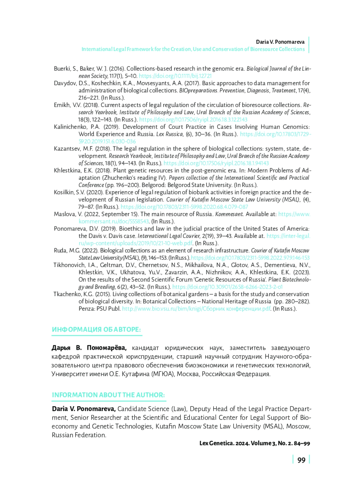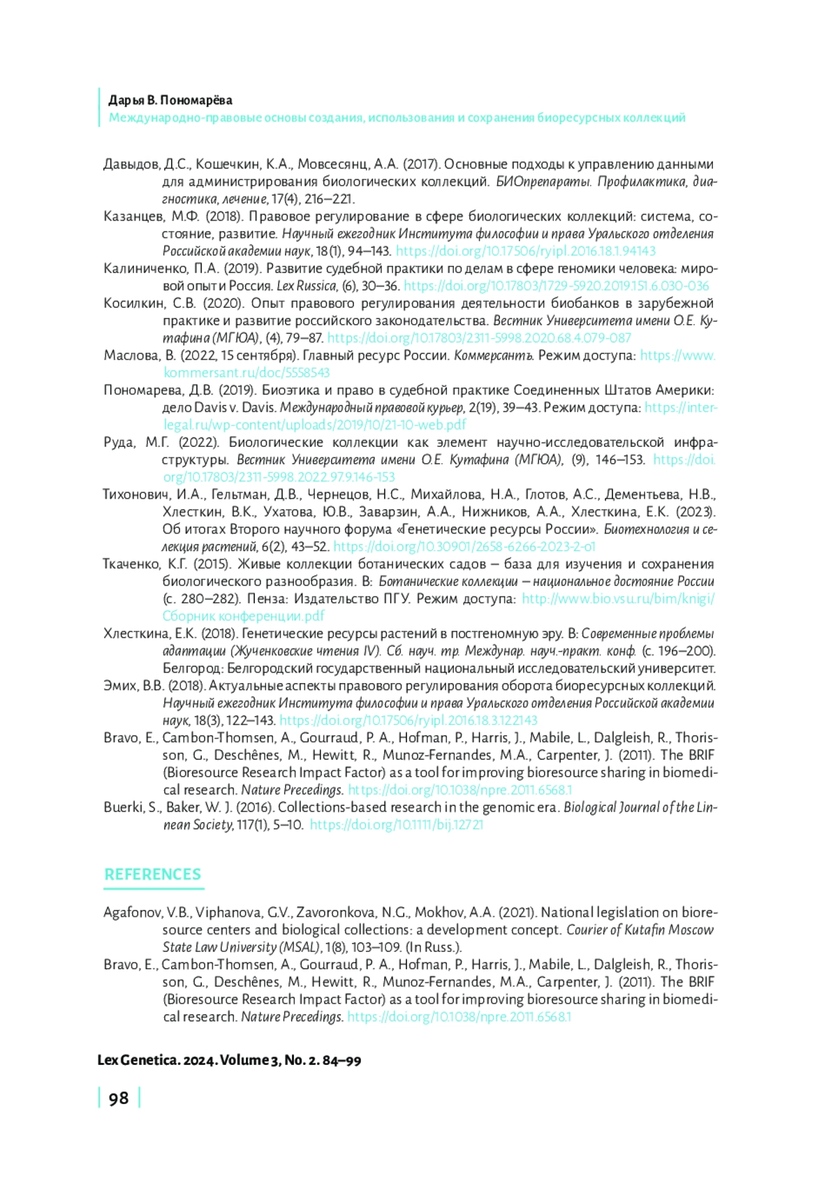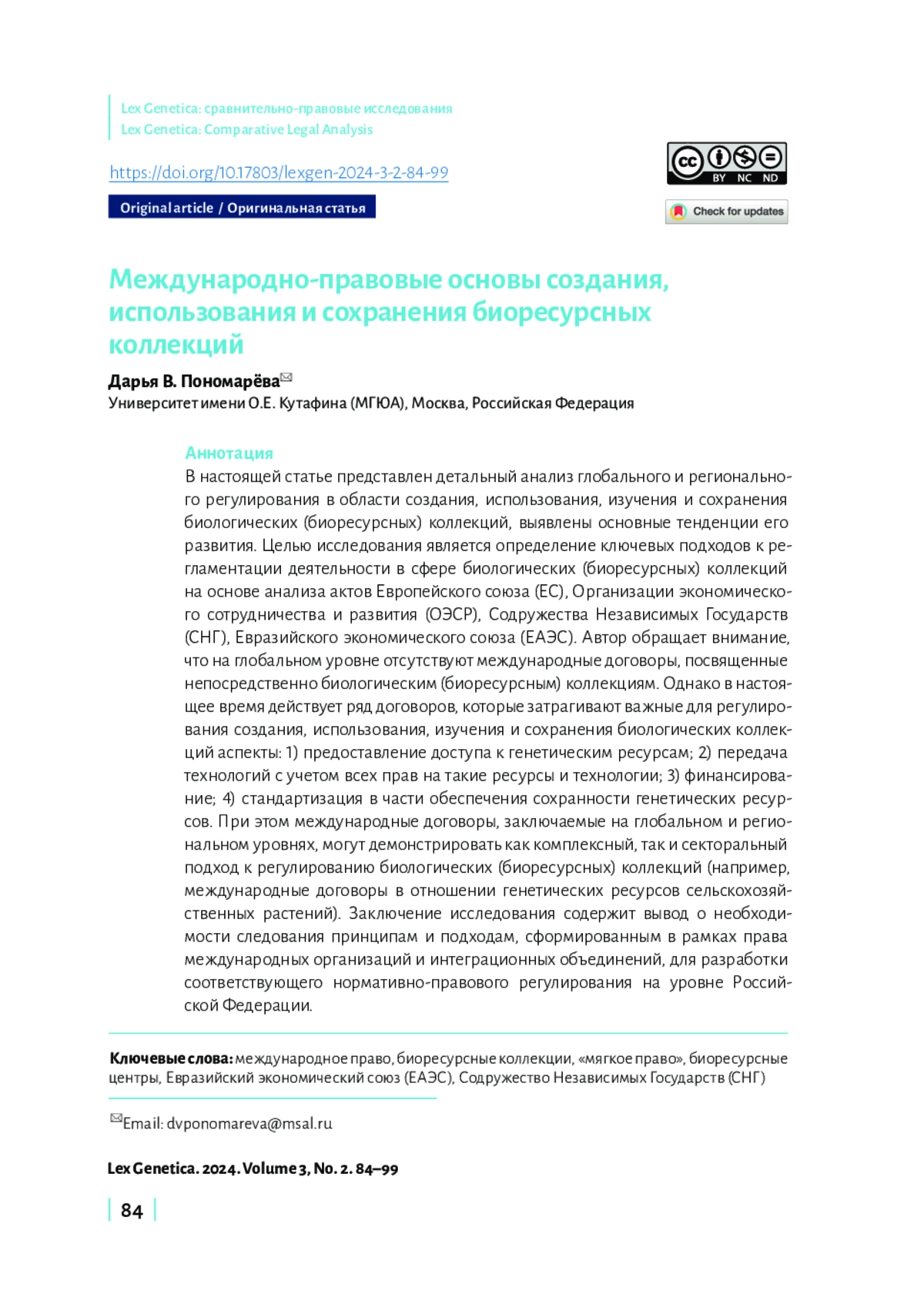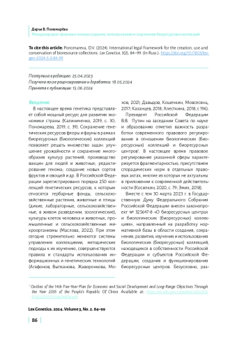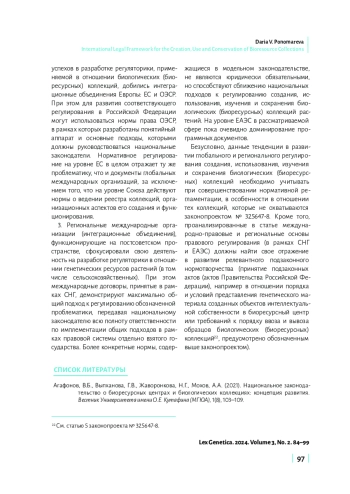 В настоящей статье представлен детальный анализ глобального и регионального регулирования в области создания, использования, изучения и сохранения биологических (биоресурсных) коллекций, выявлены основные тенденции его развития. Целью исследования является определение ключевых подходов к регламентации деятельности в сфере биологических (биоресурсных) коллекций на основе анализа актов Европейского союза (ЕС), Организации экономического сотрудничества и развития (ОЭСР), Содружества Независимых Государств (СНГ), Евразийского экономического союза (ЕАЭС). Автор обращает внимание, что на глобальном уровне отсутствуют международные договоры, посвященные непосредственно биологическим (биоресурсным) коллекциям. Однако в настоящее время действует ряд договоров, которые затрагивают важные для регулирования создания, использования, изучения и сохранения биологических коллекций аспекты: 1) предоставление доступа к генетическим ресурсам; 2) передача технологий с учетом всех прав на такие ресурсы и технологии; 3) финансирование; 4) стандартизация в части обеспечения сохранности генетических ресурсов. При этом международные договоры, заключаемые на глобальном и региональном уровнях, могут демонстрировать как комплексный, так и секторальный подход к регулированию биологических (биоресурсных) коллекций (например, международные договоры в отношении генетических ресурсов сельскохозяйственных растений). Заключение исследования содержит вывод о необходимости следования принципам и подходам, сформированным в рамках права международных организаций и интеграционных объединений, для разработки соответствующего нормативно-правового регулирования на уровне Российской Федерации.