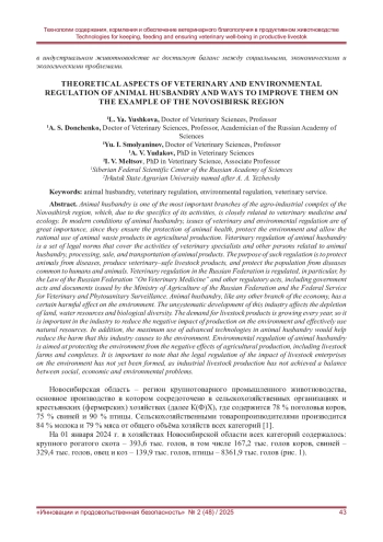 Животноводство - одна из важнейших отраслей агропромышленного комплекса Новосибирской области, которая из-за специфики своей деятельности тесно связана с ветеринарией и экологией. В современных условиях ведения животноводства вопросы ветеринарного и экологического регулирования имеют большое значение, поскольку обеспечивают охрану здоровья животных, защищают окружающую среду и позволяют рационально использовать продукты жизнедеятельности животных в сельскохозяйственном производстве. Ветеринарное регулирование животноводства - это совокупность юридических норм, которые охватывают деятельность ветеринарных специалистов и других лиц, связанных с животноводством, переработкой, реализацией, транспортировкой продукции животного происхождения. Цель такого регулирования - защита животных от болезней, выпуск безопасных в ветеринарном отношении продуктов животноводства и защита населения от болезней, общих для человека и животных. Ветеринарное регулирование в Российской Федерации регламентируется в частности Законом РФ «О ветеринарии» и другими нормативными актами, включая правительственные акты и документы, которые издают Министерство сельского хозяйства РФ и Федеральная служба по ветеринарному и фитосанитарному надзору. Животноводство, как и любая другая отрасль экономики, оказывает определённое вредное воздействие на окружающую среду. Бессистемное развитие данной отрасли влияет на истощение земель, водных ресурсов и биологического разнообразия. С каждым годом растёт спрос на продукцию животноводства, поэтому в отрасли важно снижать негативное влияние производства на окружающую среду и эффективно использовать природные ресурсы. В частности, максимальное применение передовых технологий в животноводстве способствовало бы уменьшению вреда, который эта отрасль наносит экологии. Экологическое регулирование животноводства нацелено на защиту окружающей среды от негативного влияния сельскохозяйственного производства, в том числе животноводческих ферм и комплексов. Важно отметить, что правовое регулирование воздействия животноводческих предприятий на окружающую среду ещё не сформировано, так как в индустриальном животноводстве не достигнут баланс между социальными, экономическими и экологическими проблемами.