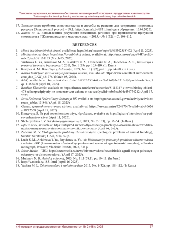 12. Данилова Ю. Для решения проблемы с отходами животноводства нужно менять устаревшие нормативы по микроэлементам [Электронный ресурс] // InfoPro54.ru. - URL: https://infopro54.ru/news/dlya-resheniya-problemy-s-otxodami-zhivotnovodstva-nuzhno-menyat-ustarevshie-normativy-po-mikroelementam/(дата обращения: 04.04.2025).