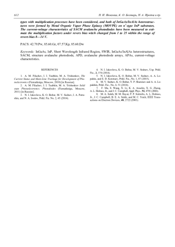 Яковлева Н. И., Болтарь К. О., Иродов Н. А., Климанов Е. А. Матричные лавинные фотодиоды на основе гетероэпитаксиальных структур InGaAs/InAlAs/InP с разделенными областями поглощения и умножения 606