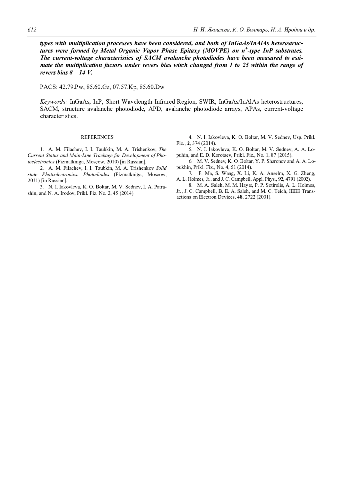 4. N. I. Iakovleva, K. O. Boltar, M. V. Sednev, Usp. Prikl. Fiz., 2, 374 (2014).