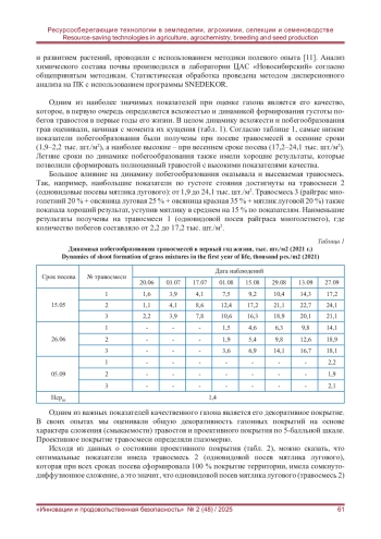 Газон - один из основных элементов благоустройства любой территории, где эффект быстрого и качественного озеленения является основополагающим. Для решения данного вопроса многие производители предлагают недолговечные, но быстроразвивающиеся виды трав (райграс пастбищный) или пытаются разбавить ими качественные травосмеси, что в последствии негативно сказывается на качественных показателях травостоя и требует дополнительных затрат. Изучалась всхожесть, динамика формирования густоты побегов травостоя и декоративное покрытие при разных сроках посева, различных травосмесей. В результате было установлено, что самые низкие показатели побегообразования фиксируются при посеве травосмесей в осенние сроки (1,9-2,2 тыс. шт./м2), а наиболее высокие - при весеннем сроке посева (17.2-24.1 тыс. шт./м2). Установлено, что динамика побегообразования сильно зависит от высеваемой травосмеси. Так, наибольшие показатели по густоте стояния достигнуты на одновидовых посевах мятлика лугового, которые в силу своих особенностей при всех сроках посева сформировали 100 % покрытие территории и имели сомкнуто-диффузионное сложение, а это значит, что данная травосмесь формирует практически сплошной травостой, устойчивый к систематическому скашиванию.