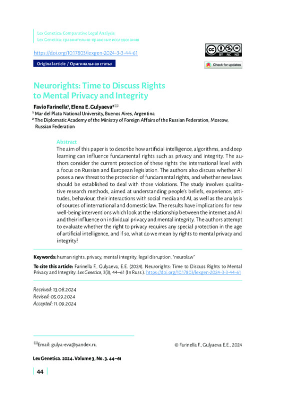 Статья представляет собой научное исследование и направлена на описание того, каким образом искусственный интеллект, алгоритмы и глубокое обучение влияют на основные права человека, такие как конфиденциальность и целостность. Авторы оценивают состояние текущей защиты рассматриваемых прав на международном уровне, уделяя особое внимание российскому и европейскому законодательствам. Авторы также анализируют, представляет ли ИИ новую угрозу защите прав и, как следствие, должны ли быть признаны новые права в списке основных прав и свобод человека для борьбы с этими нарушениями. Авторами используется качественный метод исследования, чтобы понять убеждения, опыт, отношения, поведение и взаимодействие людей с социальными сетями и искусственным интеллектом. Авторы используют источники международного и внутригосударственного права. Результаты имеют значение для новых мер по обеспечению благополучия, которые учитывают взаимосвязь между интернетом и искусственным интеллектом в отношении конфиденциальности и психической целостности личности. В статье делается попытка оценить, нуждается ли право на неприкосновенность частной жизни в какой-либо специальной защите в эпоху искусственного интеллекта, и если да, то что мы подразумеваем под правами на ментальную (психическую) неприкосновенность и целостность?