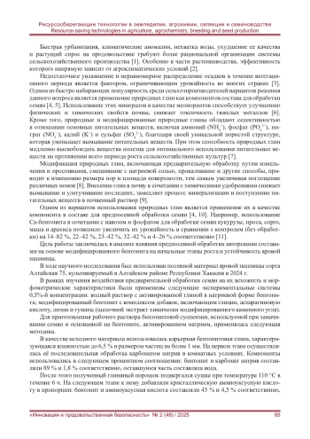 В современном растениеводстве особую актуальность приобретает разработка методов предпосевной обработки семян. Одним из перспективных направлений является использование модифицированных бентонитов в качестве стимуляторов роста и защитных агентов. Исследование проводилось на семенах яровой пшеницы, которые подвергались 5-минутной обработке в 0,5%-х водных суспензиях активированного природного минерала бентонита, модифицированного различными аминокислотами и гуматами. Контролем служили необработанные семена. Анализ полученных данных показал значительное влияние модифицированного бентонита на показатели энергии прорастания и всхожести семян. Значения энергии прорастания обработанных семян превышали контрольные на 10-21,9 %. Морфометрические исследования выявили существенное увеличение длины проростков, обработанных Na-глиной с глицином и лизином, и стимулирующий эффект данного состава на рост главного корня. Наилучшие результаты по развитию корневой системы продемонстрировали образцы, обработанные Na-глиной с аспарагином (4,3-4,6 корешков). Наибольшая концентрация антиоксидантов наблюдалась в системе с чистой Na-глиной (208,3 мг/100 г).