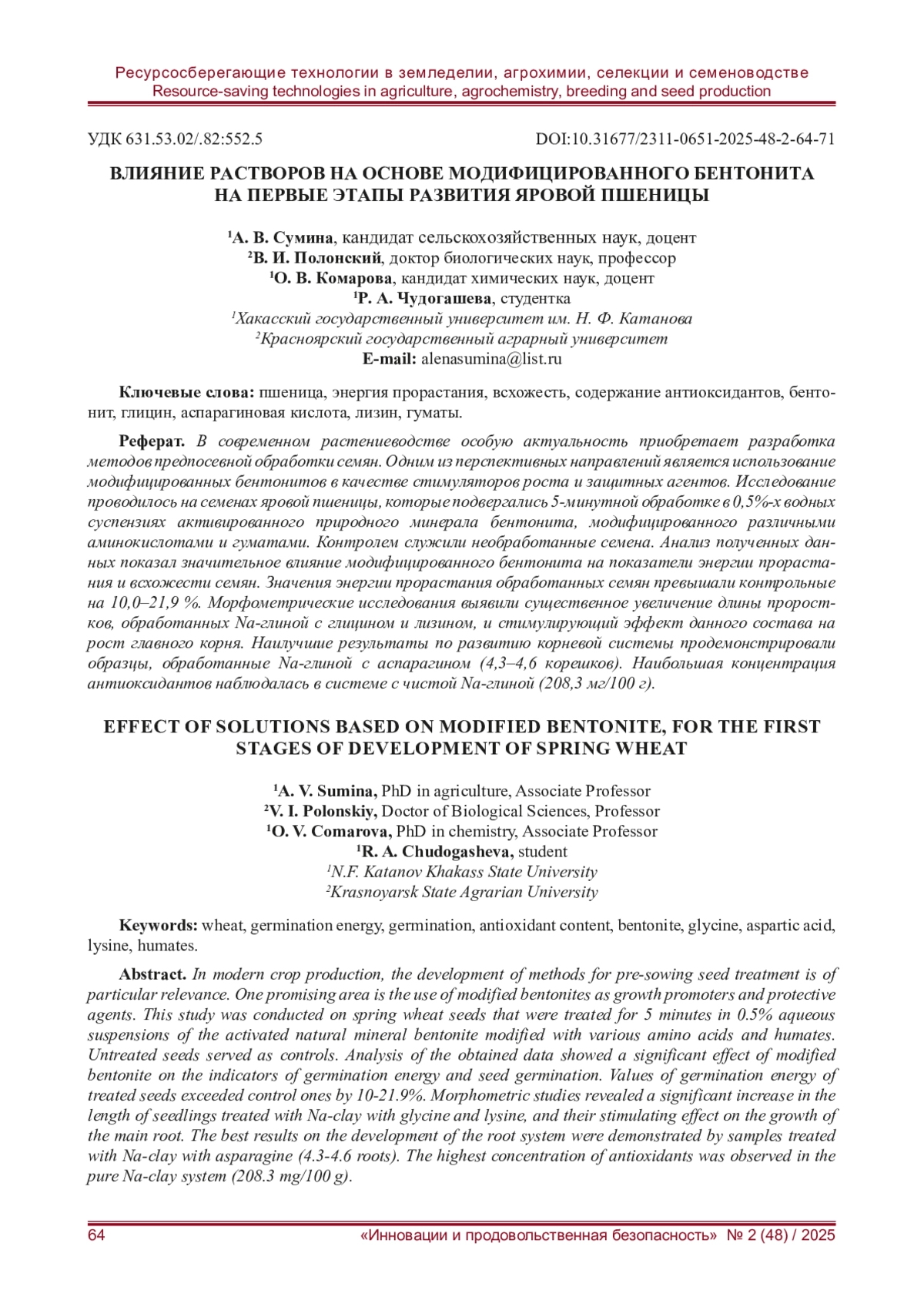 4. Влияние предпосевной обработки зерновых культур модифицированным аминокислотами бентонитом на их посевные качества / А. В. Сумина, В. И. Полонский, О. В. Комарова [и др.] // Вестник КрасГАУ. - 2024. - № 11. - С. 86-96. EDN: SQBTPH