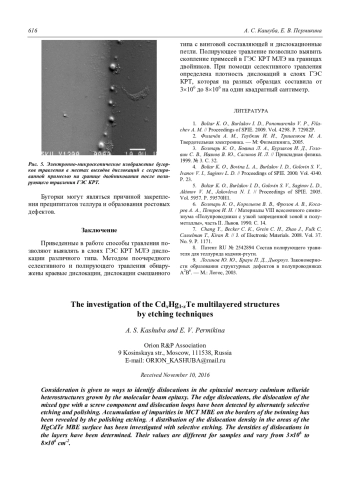 Представлены способы выявления дислокаций в эпитаксиальных слоях гетероструктур теллурида кадмия-ртути, выращенных молекулярно-лучевой эпитаксией. Путем поочередного селективного и полирующего травления обнаружены краевые дислокации, дислокации смешанного типа с винтовой составляющей и дислокационные петли. Полирующее травление позволило выявить скопление примесей в ГЭС КРТ МЛЭ на границах двойникования. При помощи селективного травления исследованы распределения плотности дислокаций на участках поверхности ГЭС КРТ МЛЭ и определена плотность дислокаций в слоях, которая на разных образцах составила от 3106 до 8106 на один квадратный сантиметр.