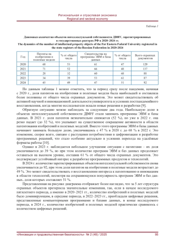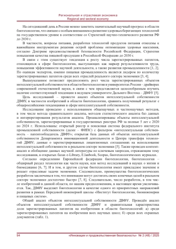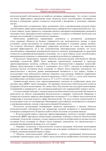 Освещается анализ тенденций развития интеллектуальной собственности в сфере биотехнологий, в том числе пищевых технологий, и биоэкономики на примере структурных подразделений Дальневосточного федерального университета (ДВФУ). В настоящее время наблюдается значительный рост патентной активности производственных организаций в области биотехнологий и пищевых технологий. Соответственно, существуют предпосылки для увеличения доли интеллектуальной собственности в вышеуказанных сферах и среди высших школ. С целью проведения анализа объектов интеллектуальной собственности ДВФУ и сравнения существующих тенденций с общероссийскими тенденциями автором получены данные из открытых источников по зарегистрированным объектам интеллектуальной собственности ДВФУ за полные 5 лет с 2020 по 2024 г. Определено, что основу патентов ДВФУ составляют объекты интеллектуальной собственности в области пищевой технологии и биотехнологии, также растет количество свидетельств на программное обеспечение для ЭВМ и базы данных в области биоэкономики. Сделан вывод, что в университете действительно существует сопоставимая с общенациональной тенденция к увеличению количества объектов интеллектуальной собственности в сфере биотехнологий и биоэкономики, так, пищевые науки занимают лидирующее положение в общей структуре зарегистрированных патентов в ДВФУ.