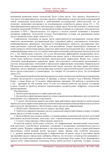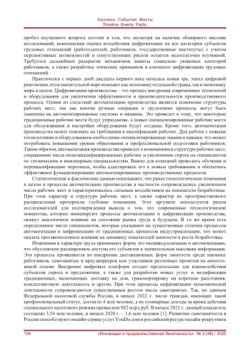 Проводится новый теоретический, а также практический анализ реализации цифровизации экономики, влияния искусственного интеллекта на рынок труда. Эти факторы кардинально меняют характер трудовых отношений, открывая новые возможности не только для бизнеса, но и для существенного роста экономики нашей страны. Развитие информационных технологий, использование искусственного интеллекта, автоматизация процессов и распространение платформ занятости приводят к новым формам существенного увеличения производительности труда, и, как следствие, экономическому росту, что крайне необходимо нашему государству в условиях проведения СВО, попыток экономической изоляции, введения санкций, развязывания экономической и реальной войны против РФ. Внедрение цифровых платформ, развитие информационных технологий и использование искусственного интеллекта позволит существенно изменить структуру экономики. В рамках этой тенденции уже сегодня создаются новые сферы деятельности, например, такие, как сервисы доставки, маркетплейсы по типу Ozon и другие, которые формируют рабочие места, увеличивают число самозанятых лиц, мелких и средних предпринимателей. Вместе с тем национальная программа «Цифровая экономика РФ» направлена прежде всего на модернизацию экономики России, повышение ее конкурентоспособности, улучшение качества жизни граждан. Она включает в себя, несколько федеральных проектов, таких как создание цифровой инфраструктуры, развитие цифрового образования и здравоохранения, цифровизация государственного управления и другие. Реализация этой программы положительно скажется на экономической безопасности нашего государства, развитие цифровой инфраструктуры позволит сделать нашу экономику более устойчивой к внешним угрозам. Кроме того, цифровые технологии способны улучшить качество жизни наших граждан, решить проблему нехватки высококвалифицированных кадров, что, в свою очередь, поможет снизить социальную напряженность в обществе и укрепить социальную стабильность в стране. А самое главное - противостоять экономической изоляции, санкциям против нашего государства, тем самым успешно разрешить серьезные проблемы и вопросы в области обеспечения экономической безопасности, а также способствовать развитию ВПК и скорейшему успешному, победному завершению специальной военной операции.