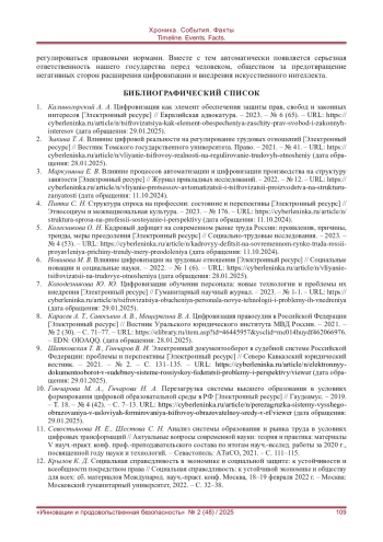 1. Калиногорский А. А. Цифровизация как элемент обеспечения защиты прав, свобод и законных интересов [Электронный ресурс] // Евразийская адвокатура. - 2023. - № 6 (65). - URL: https://cyberleninka.ru/article/n/tsifrovizatsiya-kak-element-obespecheniya-zaschity-prav-svobod-i-zakonnyh-interesov (дата обращения: 29.01.2025). EDN: DMUGYN
