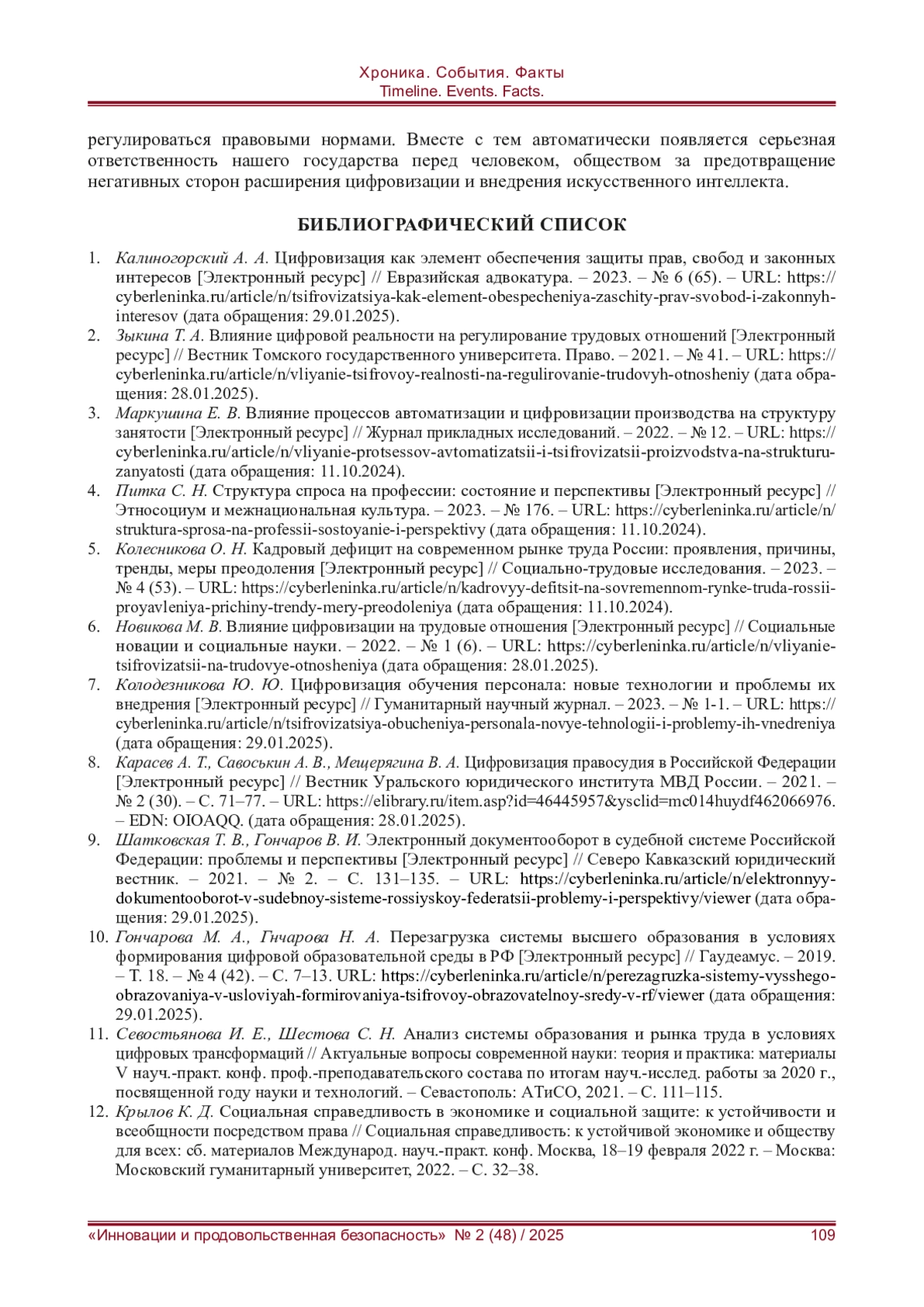 6. Новикова М. В. Влияние цифровизации на трудовые отношения [Электронный ресурс] // Социальные новации и социальные науки. - 2022. - № 1 (6). - URL: https://cyberleninka.ru/article/n/vliyanie-tsifrovizatsii-na-trudovye-otnosheniya (дата обращения: 28.01.2025). EDN: WTMRJN