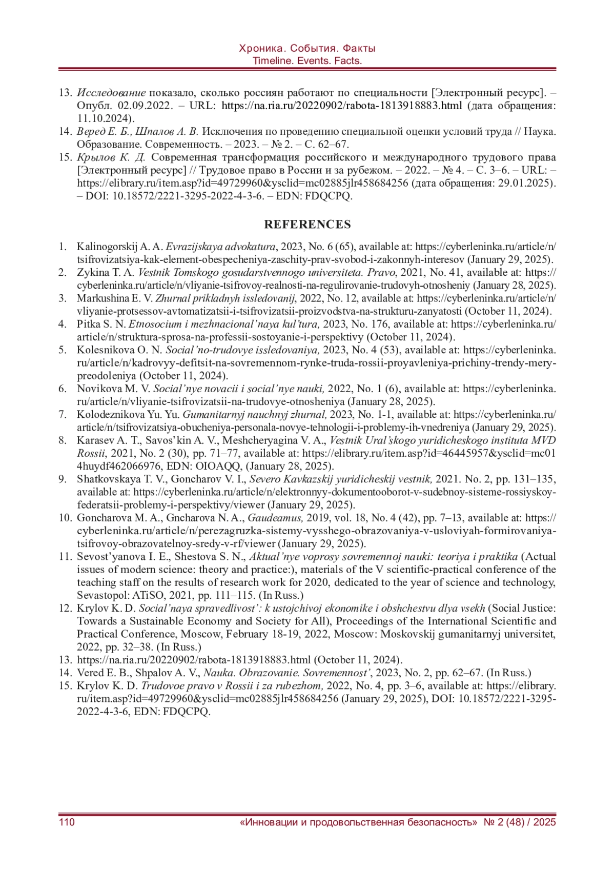 15. Крылов К. Д. Современная трансформация российского и международного трудового права [Электронный ресурс] // Трудовое право в России и за рубежом. - 2022. - № 4. - С. 3-6. - URL: - item.asp?id=49729960&ysclid=mc02885jlr458684256 (дата обращения: 29.01.2025). - -. DOI: 10.18572/2221-3295-2022-4-3-6 EDN: FDQCPQ