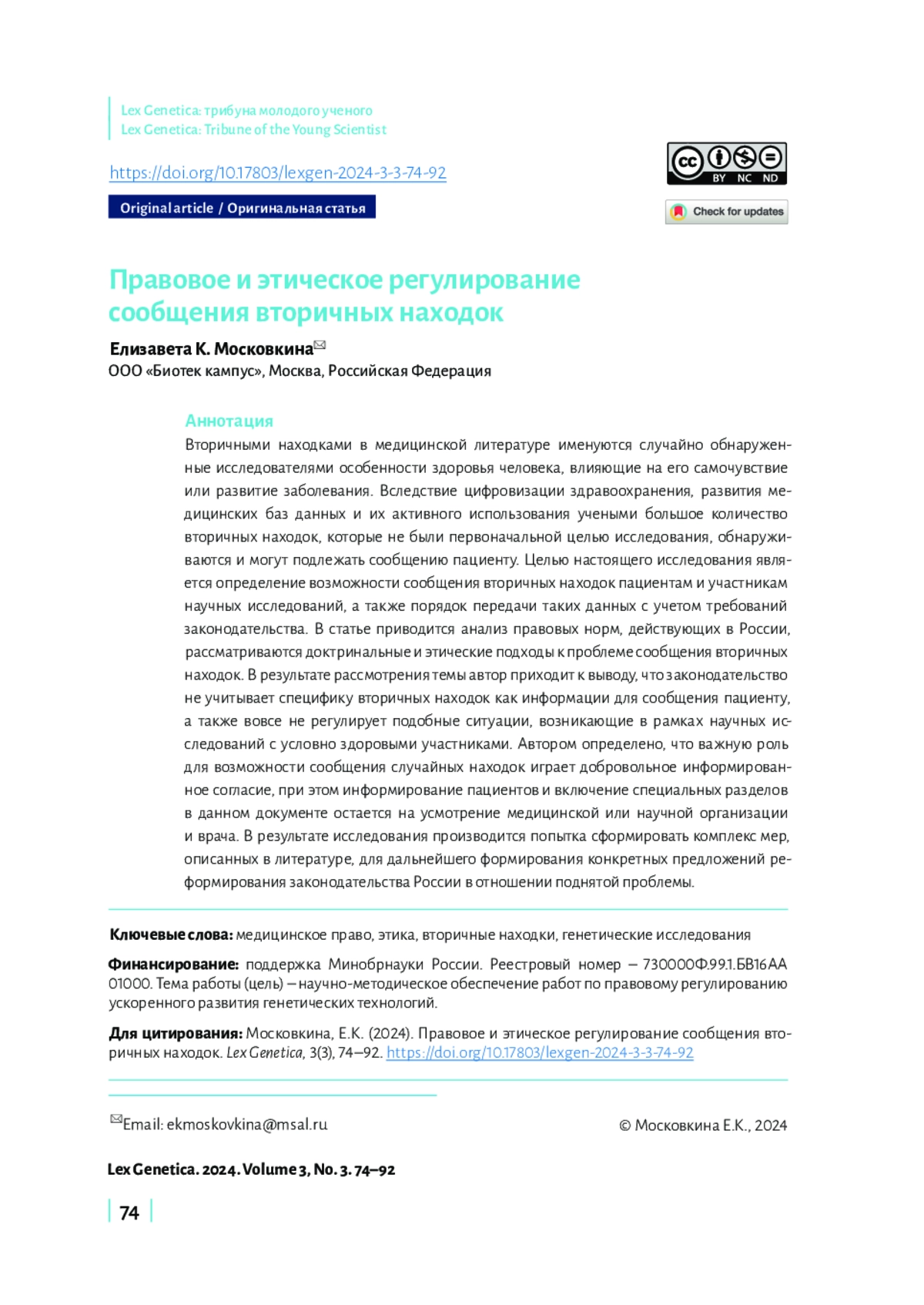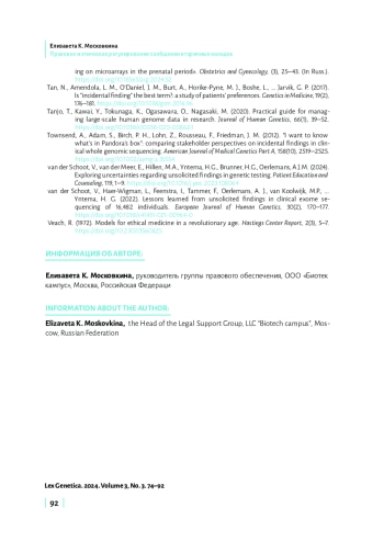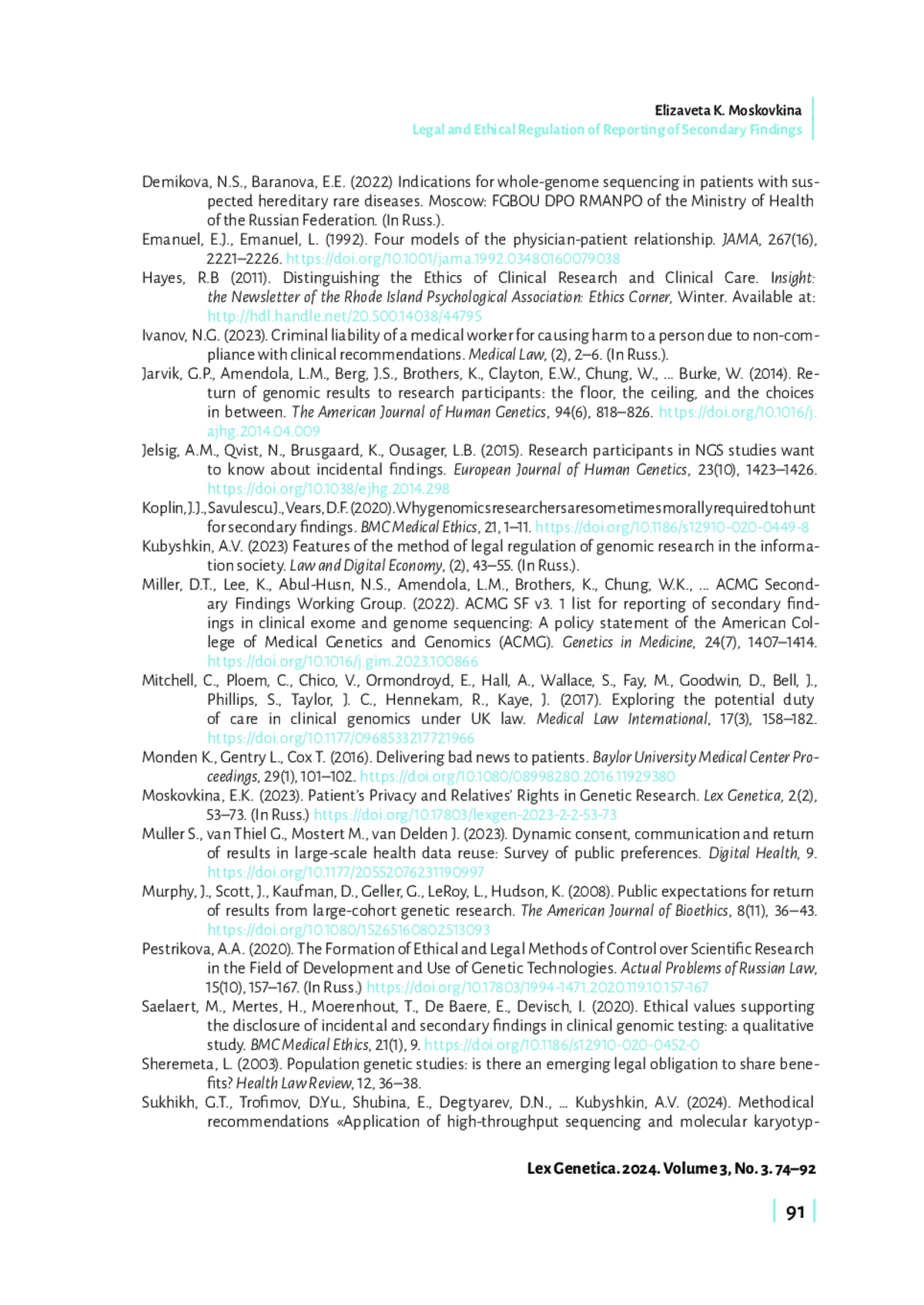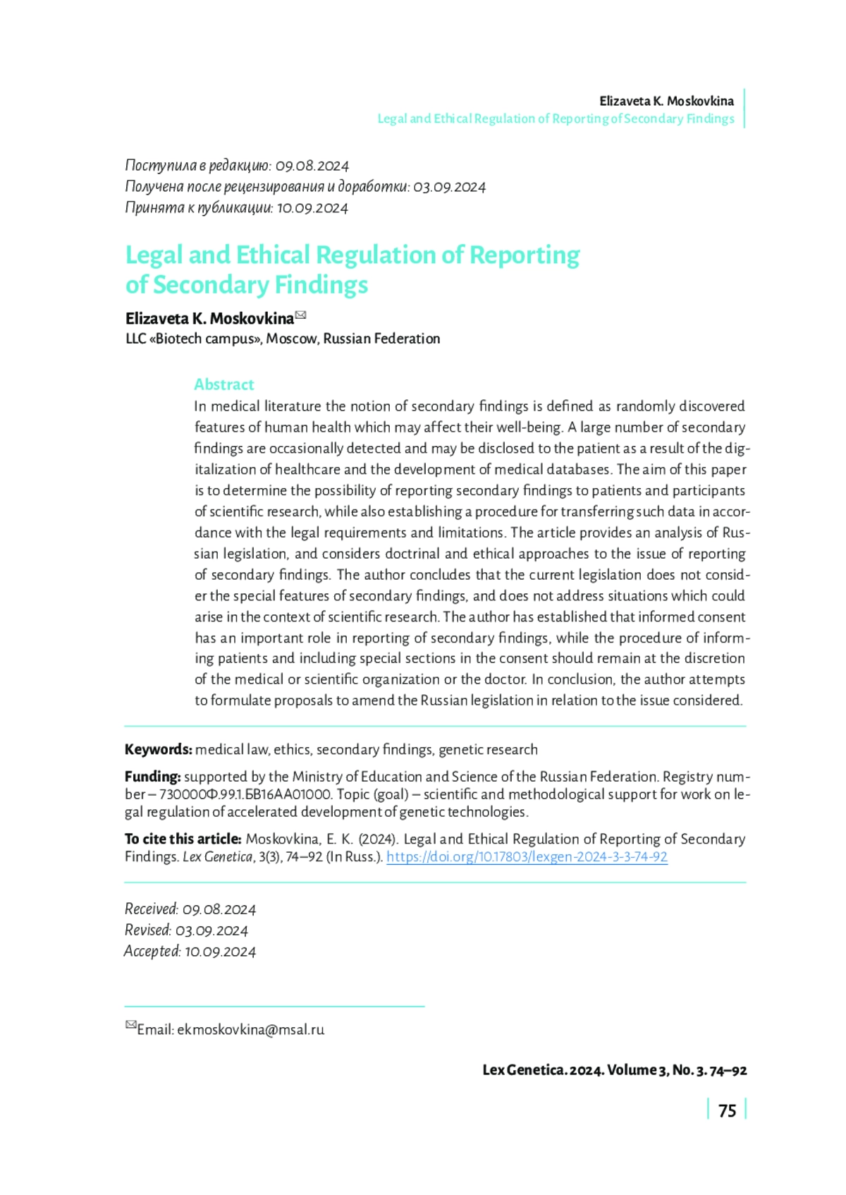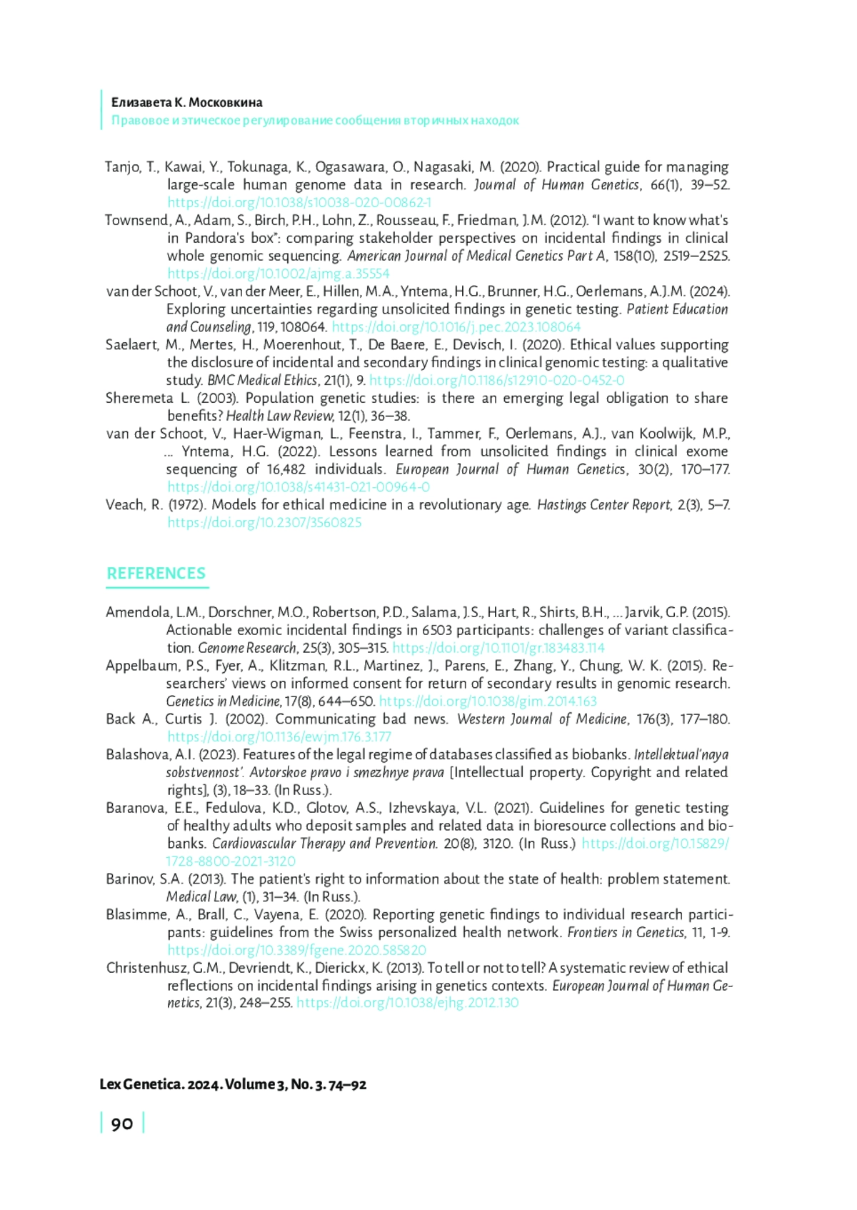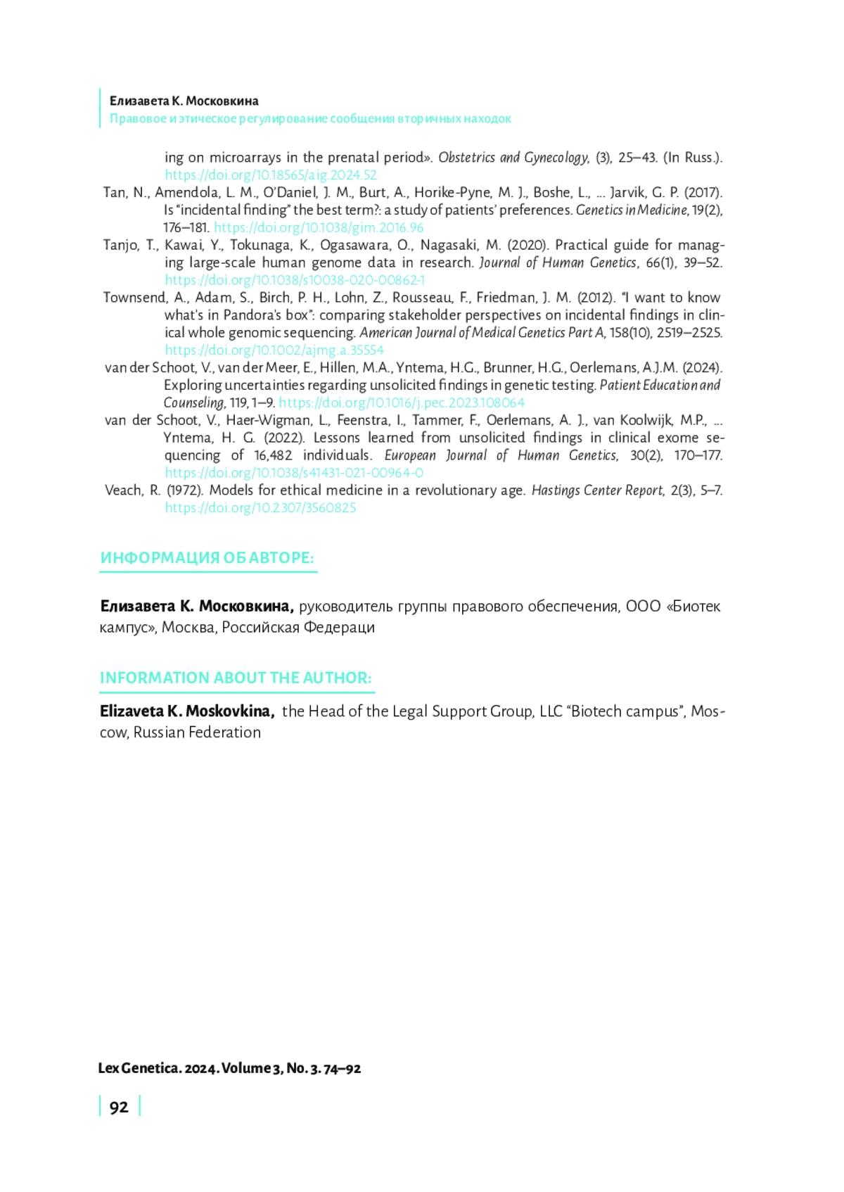 7. Московкина, Е.К. (2023). Конфиденциальность пациента и права родственников в генетических исследованиях. Lex Genetica, 2(2), 53-73. https://doi.org/10.17803/lexgen-2023-2-2-53-73