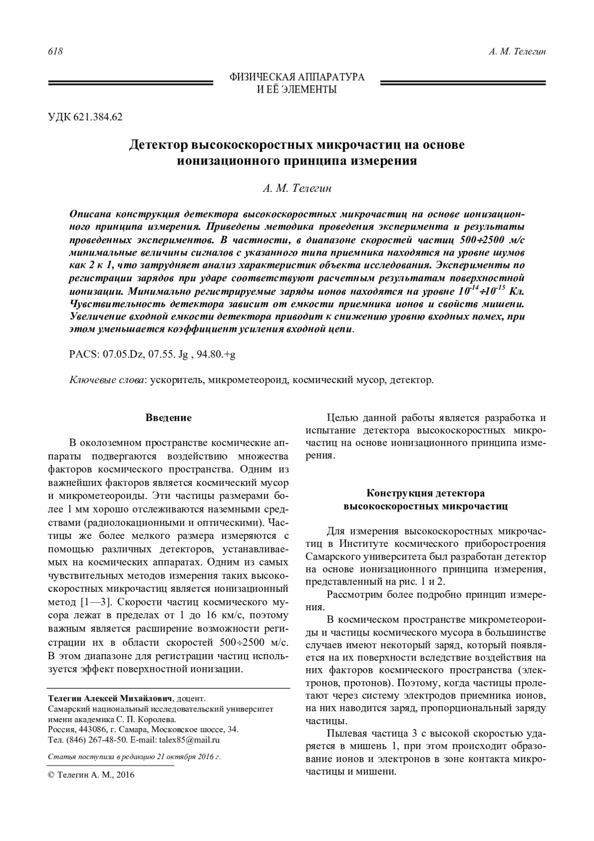 Телегин А. М. Детектор высокоскоростных микрочастиц на основе ионизационного принципа измерения 618