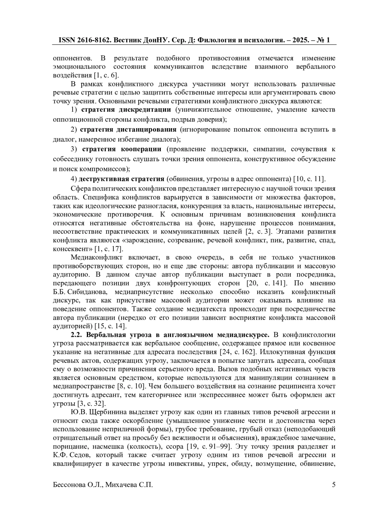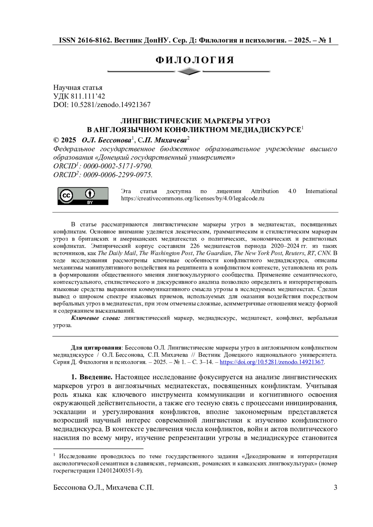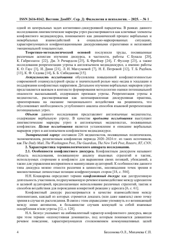 Настоящее исследование фокусируется на анализе лингвистических маркеров угроз в англоязычных медиатекстах, посвященных конфликтам. Учитывая роль языка как ключевого инструмента коммуникации и когнитивного освоения окружающей действительности, а также его тесную связь с процессами инициирования, эскалации и урегулирования конфликтов, вполне закономерным представляется возросший научный интерес современной лингвистики к изучению конфликтного медиадискурса.