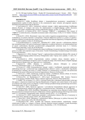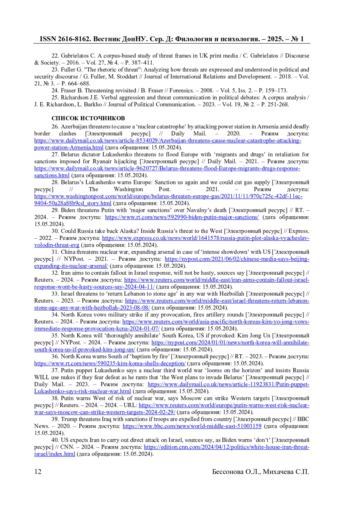 25. Richardson J.E. Verbal aggression and threat communication in political debates: A corpus analysis / J. E. Richardson, L. Barkho // Journal of Political Communication. - 2023. - Vol. 19, № 2. - P. 251-268.