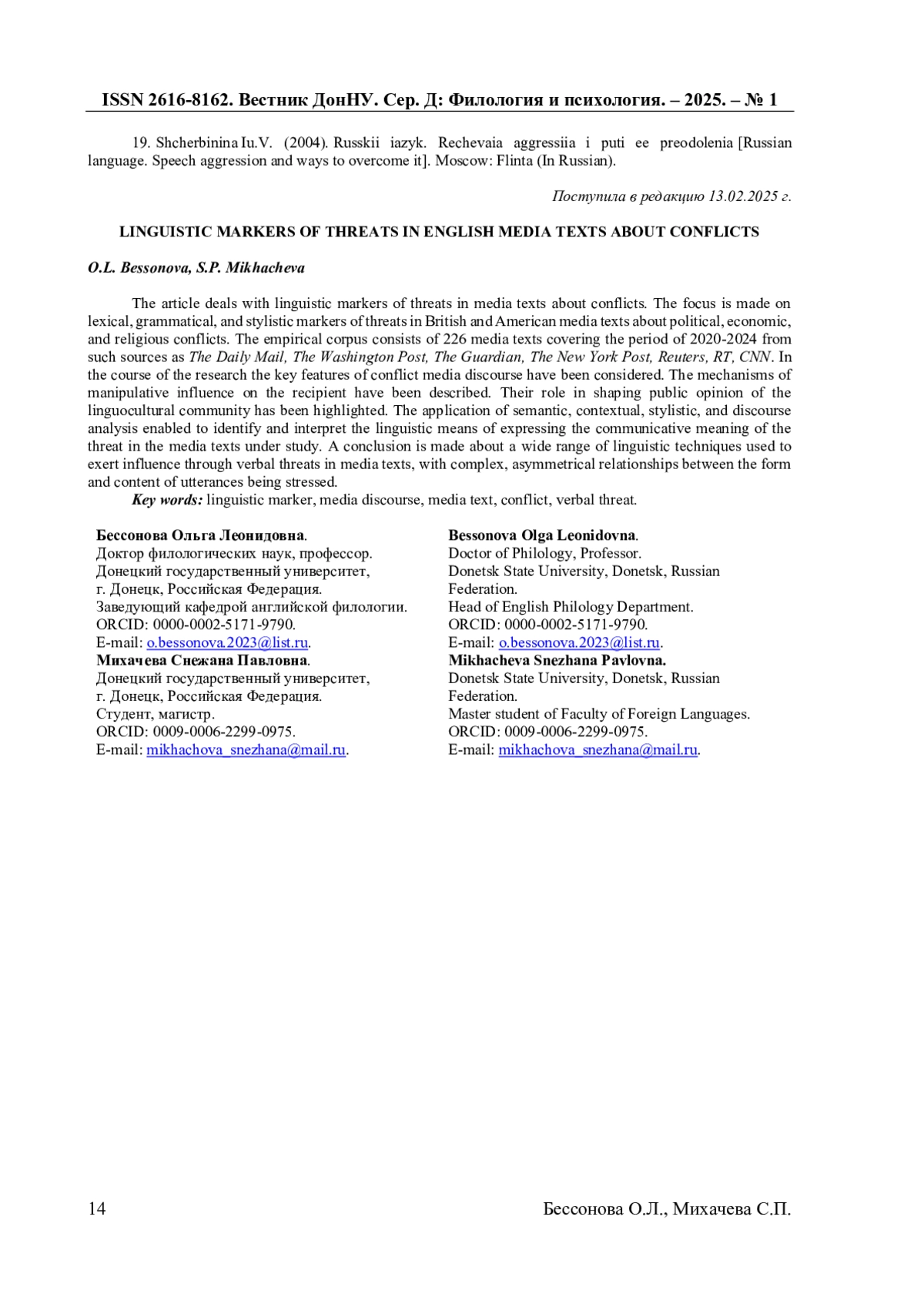 В статье рассматриваются лингвистические маркеры угроз в медиатекстах, посвященных конфликтам. Основное внимание уделяется лексическим, грамматическим и стилистическим маркерам угроз в британских и американских медиатекстах о политических, экономических и религиозных конфликтах. Эмпирический корпус составили 226 медиатекстов периода 2020-2024 гг. из таких источников, как The Daily Mail, The Washington Post, The Guardian, The New York Post, Reuters, RT, CNN. В ходе исследования рассмотрены ключевые особенности конфликтного медиадискурса, описаны механизмы манипулятивного воздействия на реципиента в конфликтном контексте, установлена их роль в формировании общественного мнения лингвокультурного сообщества. Применение семантического, контекстуального, стилистического и дискурсивного анализа позволило определить и интерпретировать языковые средства выражения коммуникативного смысла угрозы в исследуемых медиатекстах. Сделан вывод о широком спектре языковых приемов, используемых для оказания воздействия посредством вербальных угроз в медиатекстах, при этом отмечены сложные, асимметричные отношения между формой и содержанием высказываний.
