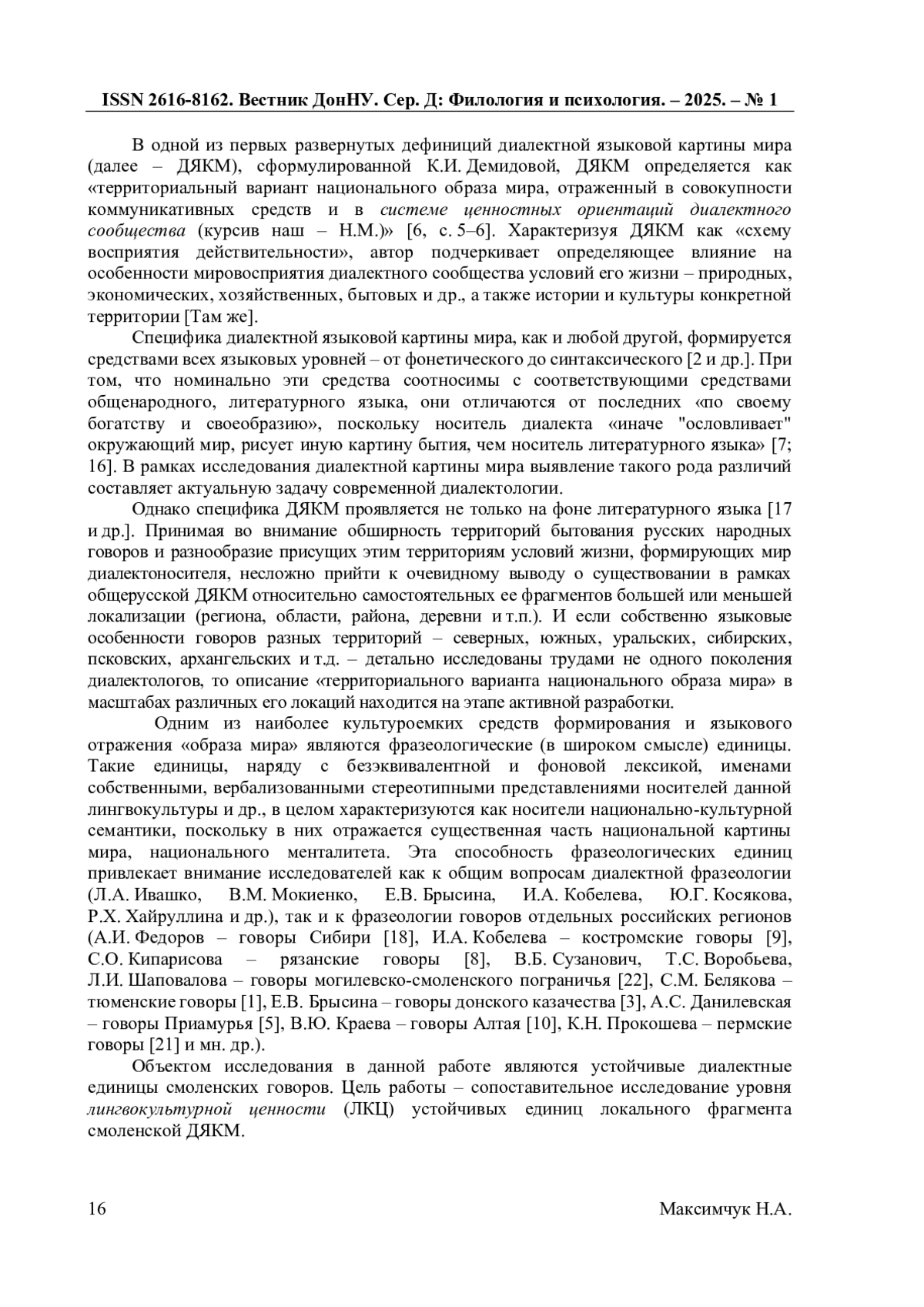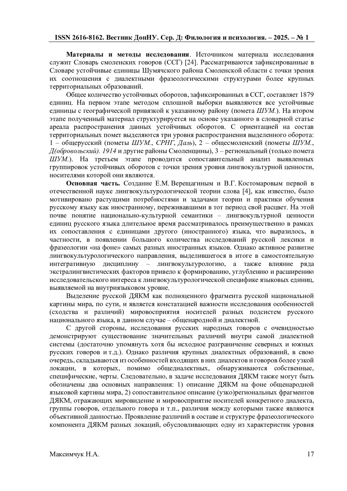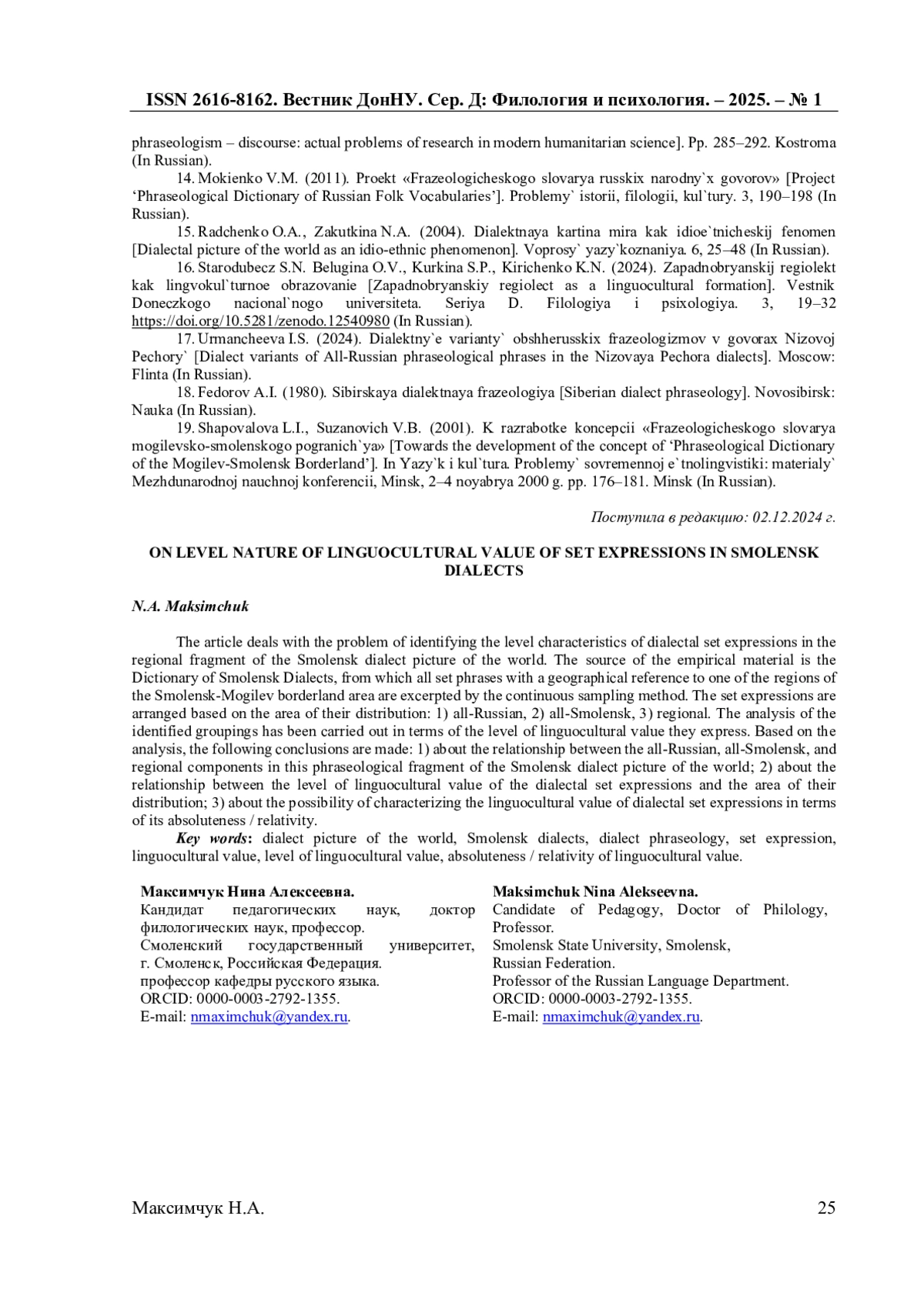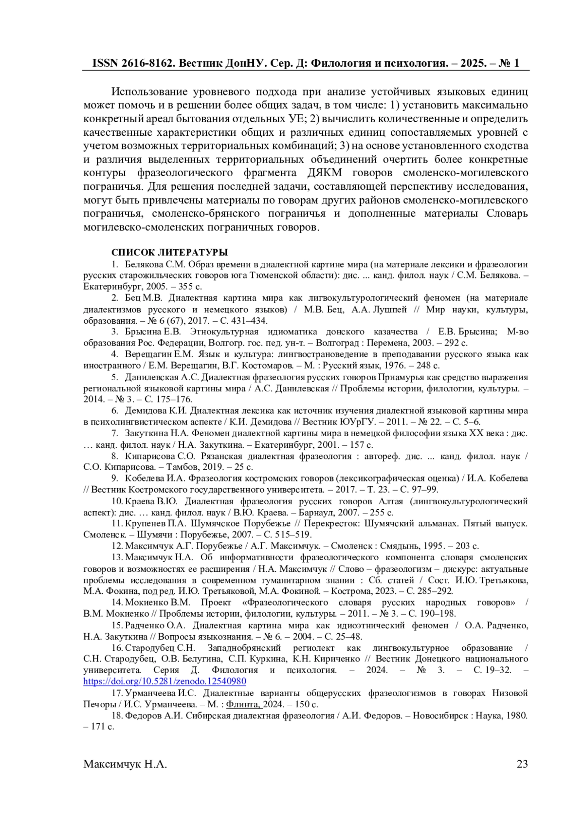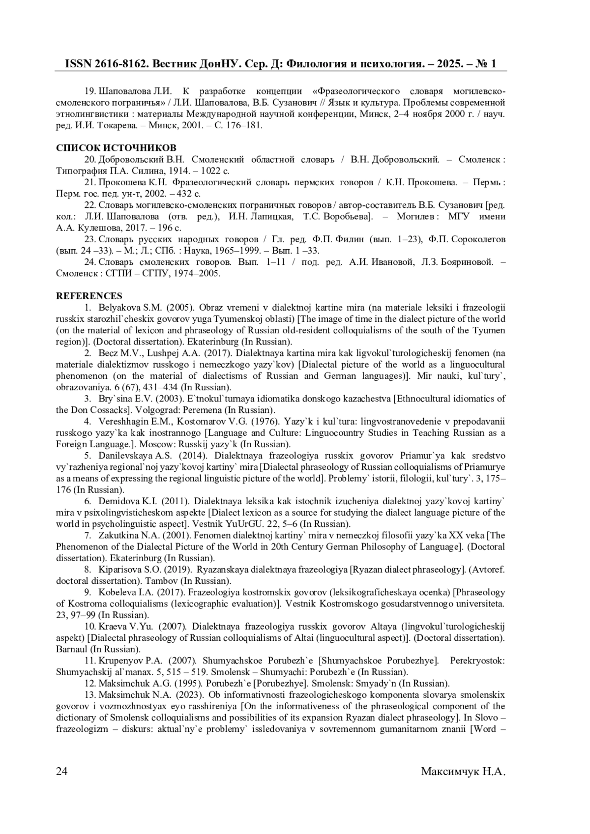 13. Максимчук Н.А. Об информативности фразеологического компонента словаря смоленских говоров и возможностях ее расширения / Н.А. Максимчук // Слово - фразеологизм - дискурс: актуальные проблемы исследования в современном гуманитарном знании: Сб. статей / Сост. И.Ю. Третьякова, М.А. Фокина, под ред. И.Ю. Третьяковой, М.А. Фокиной. - Кострома, 2023. - С. 285-292. EDN: CSMMBN