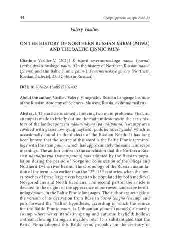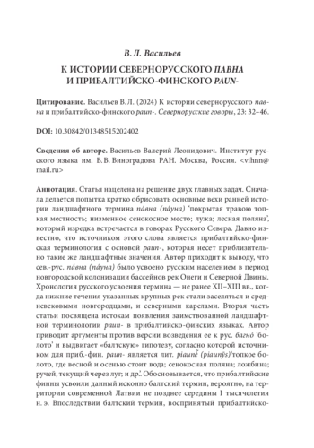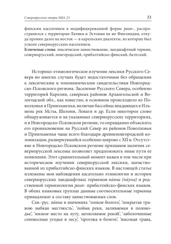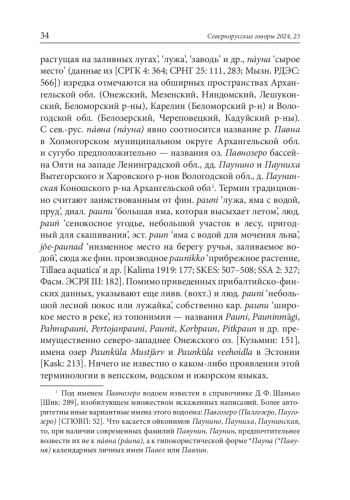 Историко-этимологическое изучение лексики Русского Севера во многих случаях будет недостаточным без обращения к лексическим и топонимическим свидетельствам Новгородско-Псковского региона. Заселение Русского Севера, особенно территорий Карелии, северных районов Архангельской и Вологодской обл., как известно, в основном происходило из Поволховья и Приильменья, включая бассейны впадающих в Ильмень рек Мсты, Шелони, Ловати и др. Если некоторое слово обнаруживается и на указанных севернорусских территориях, и в Новгородско-Псковском регионе, то оправданно объяснить его проникновение на Русский Север из районов Поволховья и Приильменья чаще всего благодаря древненовгородской колонизации, развернувшейся особенно широко с XII в. Отсутствие в Новгородско-Псковском регионе признаков наличия севернорусской лексемы позволяет предположить иные пути ее появления. Этот сравнительный момент важен в том числе при историческом изучении севернорусской лексики, заимствованной из прибалтийско-финских языков. В настоящей статье изложены мои наблюдения касательно этимологии и истории севернорусских ландшафтных терминов пáвна (пáуна) и родственной терминологии paun- прибалтийско-финских языков. В обеих языковых группах данные соотносительные термины принадлежат к составу заимствованных слов.