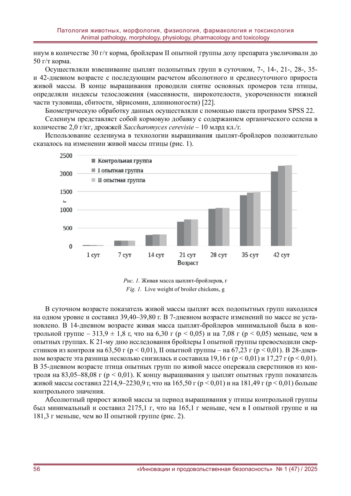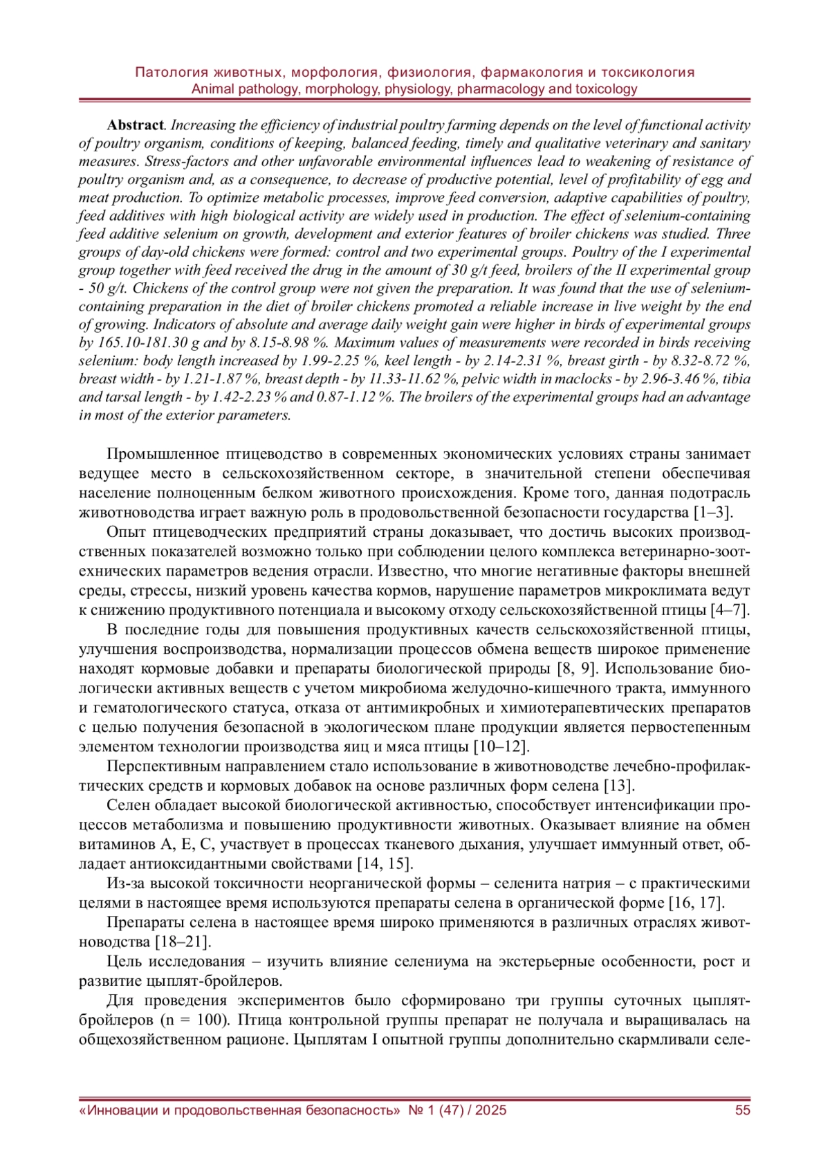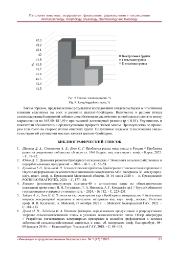 Повышение эффективности промышленного птицеводства зависит от уровня функциональной активности организма птицы, условий содержания, сбалансированного кормления, своевременного и качественного проведения ветеринарно-санитарных мероприятий. Стресс-факторы и другие неблагоприятные воздействия внешней среды приводят к ослаблению резистентности организма сельскохозяйственной птицы и, как следствие, к снижению продуктивного потенциала, уровня рентабельности производства яиц и мяса. Для оптимизации обменных процессов, улучшения конверсии корма, адаптационных возможностей птицы широкое применение в производстве находят кормовые добавки с высокой биологической активностью. Изучено влияние селенсодержащей кормовой добавки селениум на рост, развитие и экстерьерные особенности цыплят-бройлеров. Было сформировано три группы суточных цыплят: контрольная и две опытные. Птица I опытной группы вместе скормом получала препарат в количестве 30 г/т корма, бройлеры II опытной группы - 50 г/т. Цыплятам контрольной группы препарат не задавали. Установлено, что использование селенсодержащего препарата в рационе цыплят-бройлеров способствовало к концу выращивания достоверному увеличению живой массы. Показатели абсолютного и среднесуточного прироста массы были выше у птицы опытных групп на 165,10-181,30 г и на 8,15-8,98 %. Максимальные значения промеров зафиксированы у птицы, получавшей селениум: длина туловища увеличилась на 1,99-2,25 %, длина киля - на 2,14-2,31 %, обхват груди - на 8,32-8,72 %, ширина груди - на 1,21-1,87 %, глубина груди - на 11,33-11,62 %, ширина таза в маклоках - на 2,96-3,46 %, длина голени и плюсны - на 1,42-2,23 % и 0,87-1,12 %. По большинству показателей экстерьера преимущество было на стороне бройлеров опытных групп.
