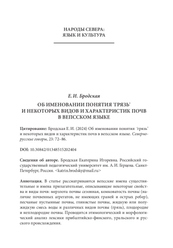 В работе рассматриваются именования различных состояний почвы, грунта. В рамках исследования анализируется лексика, описывающая понятие ‘грязь’ и некоторые названия состояний и видов почвы: рыхлая, мерзлая, оттаивающая, глинистая, комковатая, плодородная, тощая, песчаная. В нашей работе понятие ‘грязь’ рассматривается в первую очередь как характеристика состояния почвы, т. е. ‘размякшая от воды, дождя земля’, однако, в рамках анализа одной из лексем (redu), грязь рассматривается и как ‘мусор, пыль, нечистота’ [БАСРЯ: 449–450]. Слова анализируются с точки зрения семантики, этимологии и ареального функционирования в вепсском языке.