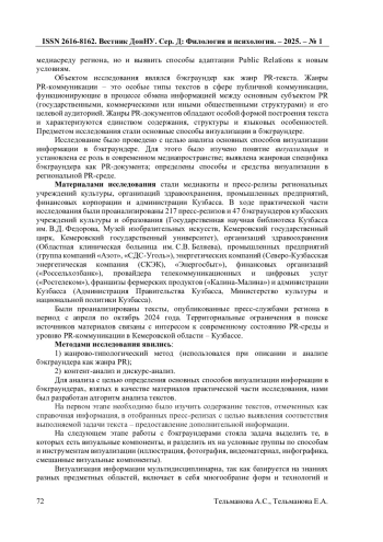 Статья исследует проблему визуализации информации в PR-текстах, а также анализирует способы поликодового создания коммуникативного фона в современной практике пиарологии в условиях конвергенции медиасистем и клиповизации мышления. Тенденция к визуализации медиатекстов и ее доминантность в современном информационном пространстве являются переломным фактором в развитии СМИ и Public Relations. В данном исследовании с помощью контент-анализа были изучены бэкграундеры пресс-служб компаний и учреждений Кузбасса с целью выделения основных способов визуализации контента в региональной PR-среде. Сделаны выводы о том, что и бэкграундер, и визуализация в настоящее время находятся на этапе оформления способов практического применения, о чем свидетельствуют проблемы анализа особенностей современного регионального PR-текста, обусловленные несоответствием реального медиапродукта с разработанными теоретическими положениями пиарологии.