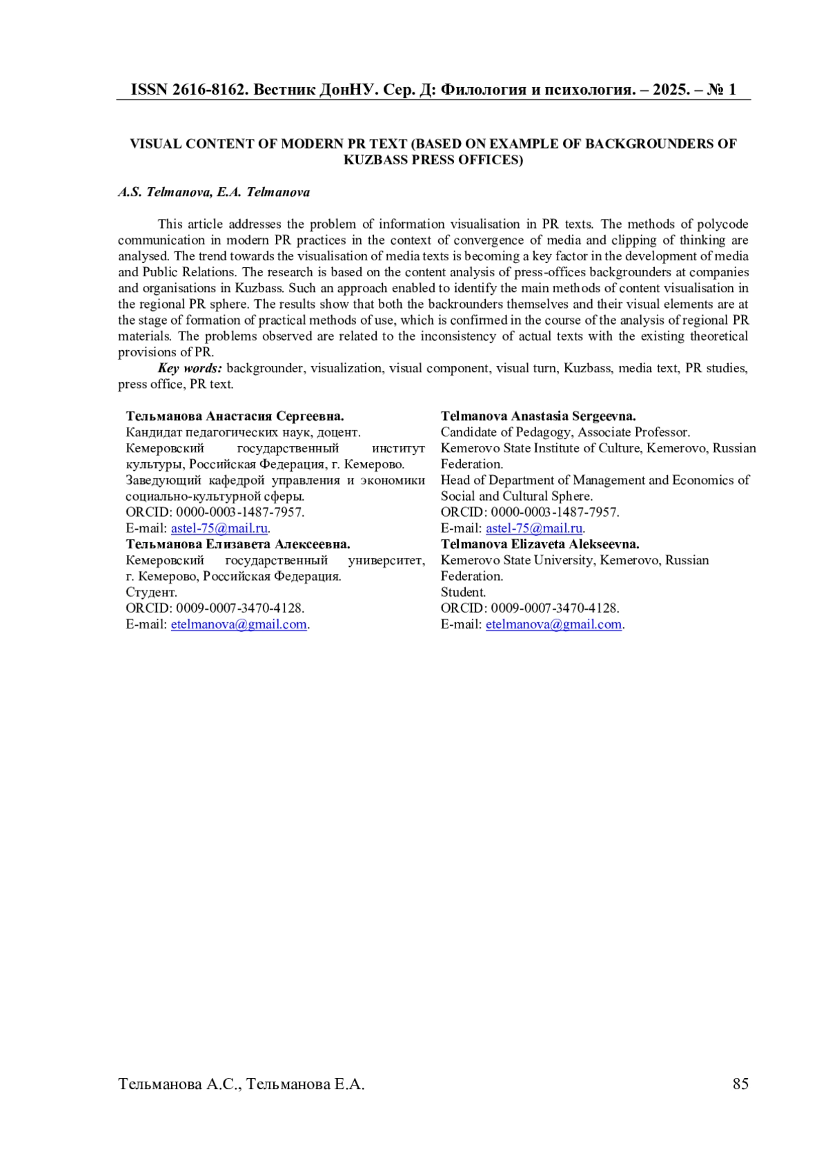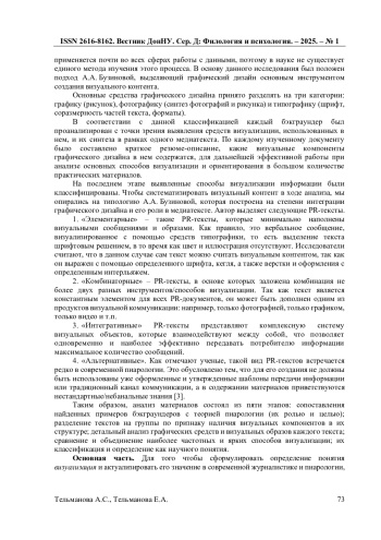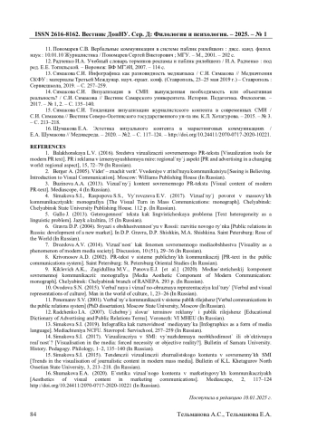 1. Балахонская Л.В. Средства визуализации современного PR-текста / Л.В. Балахонская // PR и реклама в изменяющемся мире: региональный аспект. - 2016. - №15. - С. 72-79. EDN: YFWCGZ