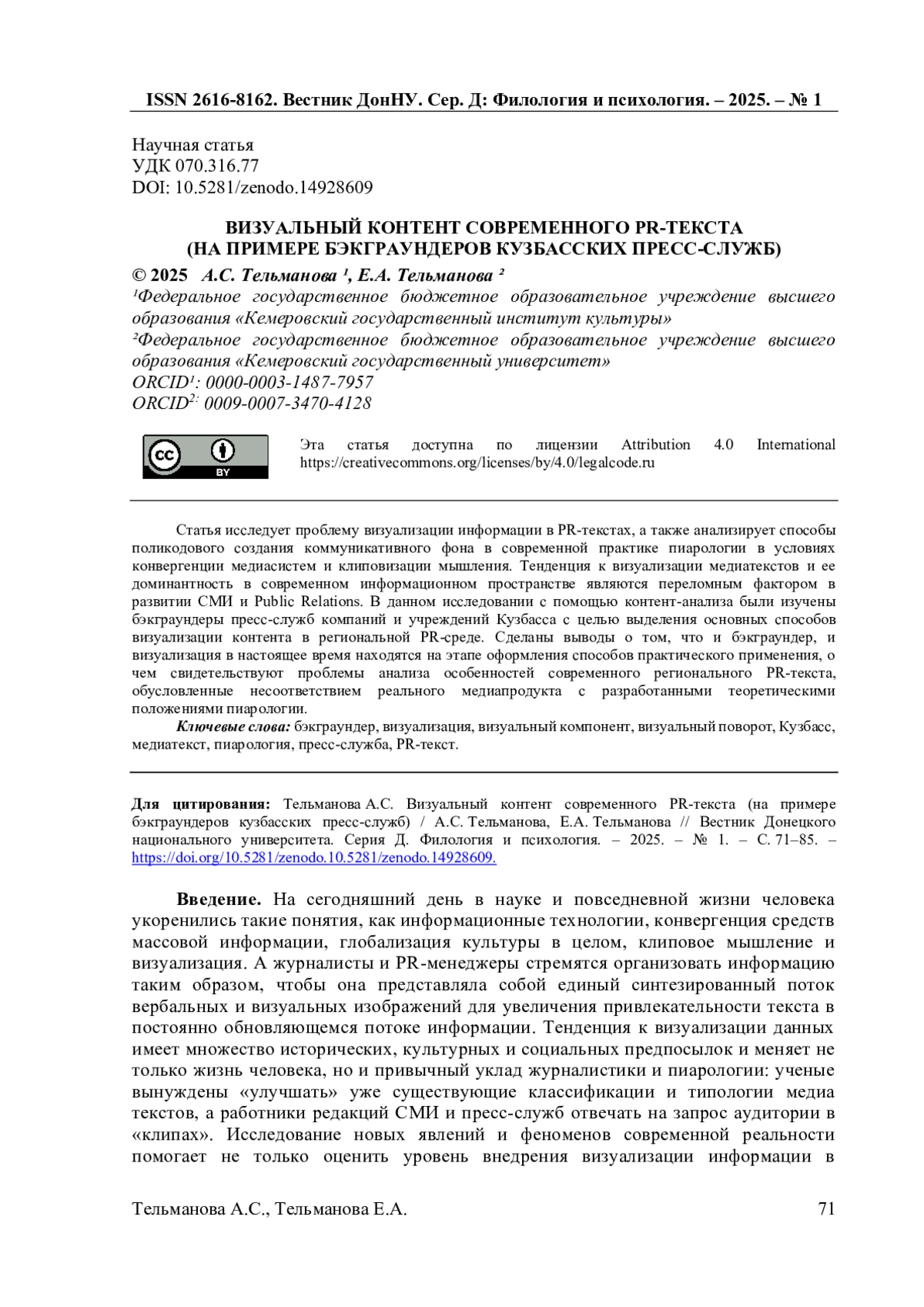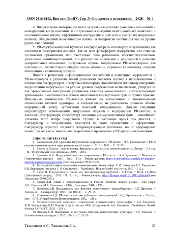 3. Бузинова А.А. Визуальный контент современного PR-текста / А.А. Бузинова // Медиаскоп [Электронный ресурс]. - 2013. - №4. - 17 с. - Режим доступа: https://cyberleninka.ru/article/n/vizualnyy-kontent-sovremennogo-pr-teksta (дата обращения: 09.01.2025). EDN: RSZLBH