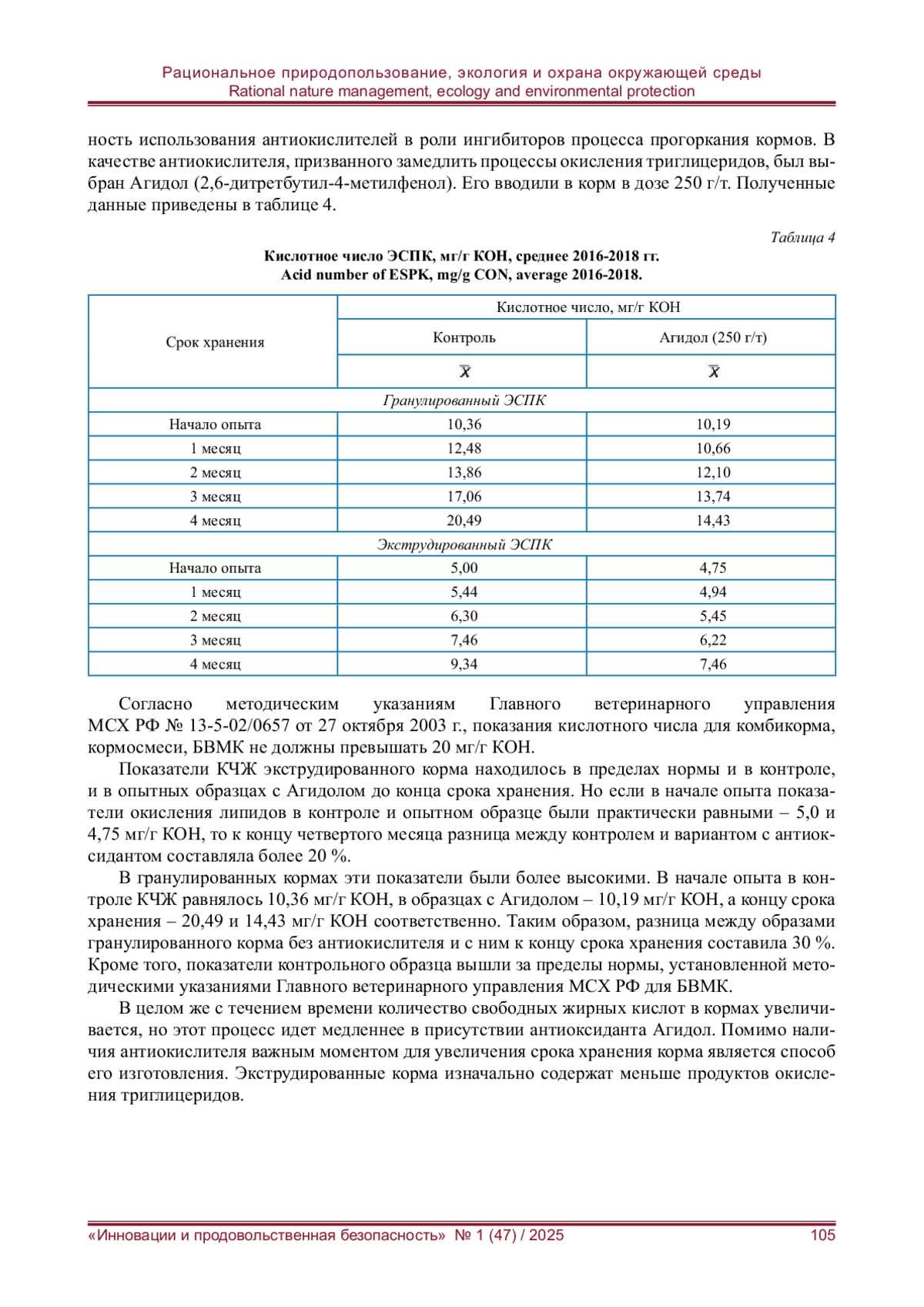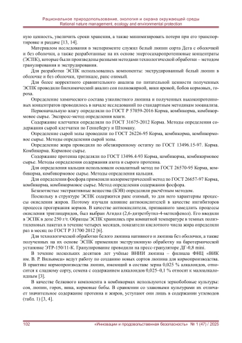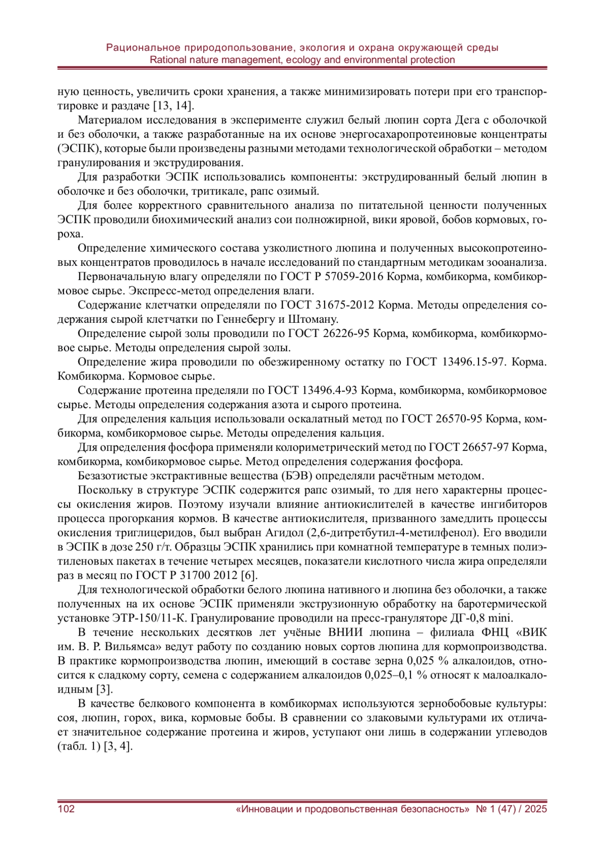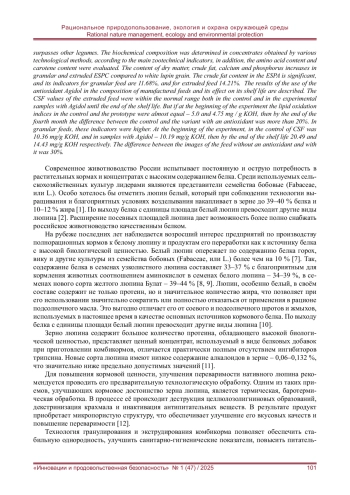 Приведены данные биохимического состава семян и аминокислотный состав зернобобовых культур, люпина белого. Было установлено, что содержание сырого протеина в зерне люпина белого выше, по сравнению с другими зернобобовыми культурами. Содержание клетчатки составляет в среднем 13,21 %, и этот показатель необходимо учитывать при использовании люпина белого в качестве корма для птицы, так как в кормах для птицы содержание клетчатки не должно превышать 10-11 %. Люпин уступает сое по содержанию жира и, соответственно, линолевой кислоты в семенах, но превосходит по этим показателям остальные бобовые культуры. В полученных разными технологическими способами концентратах определяли биохимический состав, по основным зоотехническим показателям, помимо этого оценили содержание аминокислот и каротина. В гранулированном и экструдированном ЭСПК по сравнению с зерном люпина белого увеличивается содержание сухого вещества, сырого жира, кальция и фосфора. Содержание сырого жира в ЭСПК значительно, и его показатели для гранулированного корма составляют 11,68 %, а для экструдированного - 14,21 %. Описаны результаты использования антиоксиданта Агидол в составе изготовленных кормов и его влияние на срок их хранения. Показатели КЧЖ экструдированного корма находилось в пределах нормы и в контроле, и в опытных образцах с Агидолом до конца срока хранения. Но если в начале опыта показатели окисления липидов в контроле и опытном образце были практически равными - 5,0 и 4,75 мг/г КОН, то к концу четвертого месяца разница между контролем и вариантом с антиоксидантом составляла более 20 %. В гранулированных кормах эти показатели были более высокими. В начале опыта в контроле КЧЖ равнялось 10,36 мг/г КОН, в образцах с Агидолом - 10,19 мг/г КОН, а концу срока хранения - 20,49 и 14,43 мг/г КОН соответственно. То есть разница между образами гранулированного корма без антиокислителя и с ним составила 30 %.