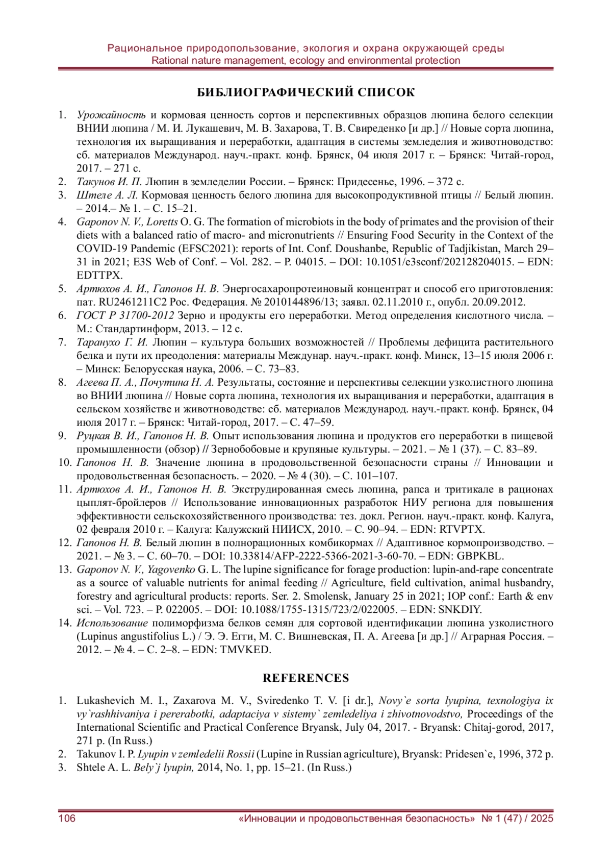 13. Gaponov N. V., Yagovenko G. L. The lupine significance for forage production: lupin-and-rape concentrate as a source of valuable nutrients for animal feeding // Agriculture, field cultivation, animal husbandry, forestry and agricultural products: reports. Ser. 2. Smolensk, January 25 in 2021; IOP conf.: Earth & env sci. - Vol. 723. - P. 022005. - -. DOI: 10.1088/1755-1315/723/2/022005 EDN: SNKDIY