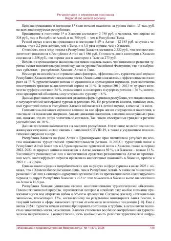Представлен глубокий обзор и анализ статистических данных по турпотоку региона и сопутствующим ему экономическим показателям. Проведён сравнительный анализ развития туристической отрасли по регионам СФО: Тыва, Красноярский край, Алтай и Хакасия; динамика изменений показателей приводится в период с 2014 по 2024 г. Обзор имеющейся научной литературы по заявленной проблематике позволил определить ряд факторов, которые оказывают значительное влияние на развитие туристической отрасли в регионах РФ. Это дало возможность выделить негативные факторы и их последствия для туристической отрасли Республики Хакасия. Был сделан вывод, что туризм при реализации всех факторов его эффективного функционирования является одной из наиболее универсальных и стремительно развивающихся отраслей народного хозяйства. В то же время для того что бы туристическая отрасль получила точку роста, ее драйвером должны стать инвестиции и особое внимание и поддержка со стороны региональных властей. Показана эффективность развития туристической отрасли для доходной части регионального бюджета, создания дополнительных рабочих мест и социализации общества.