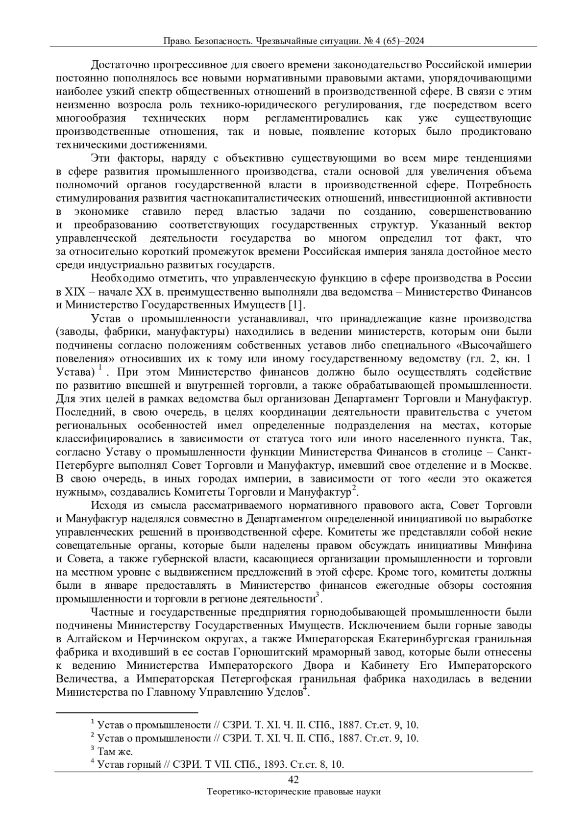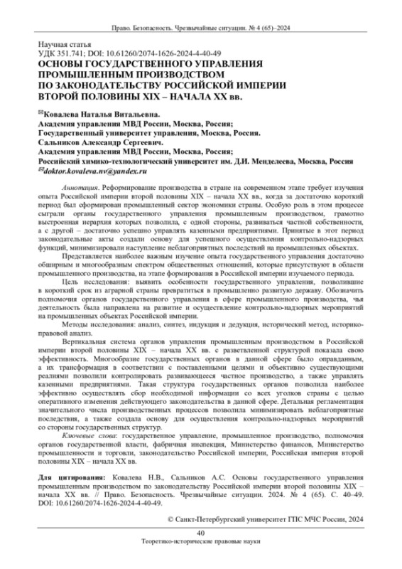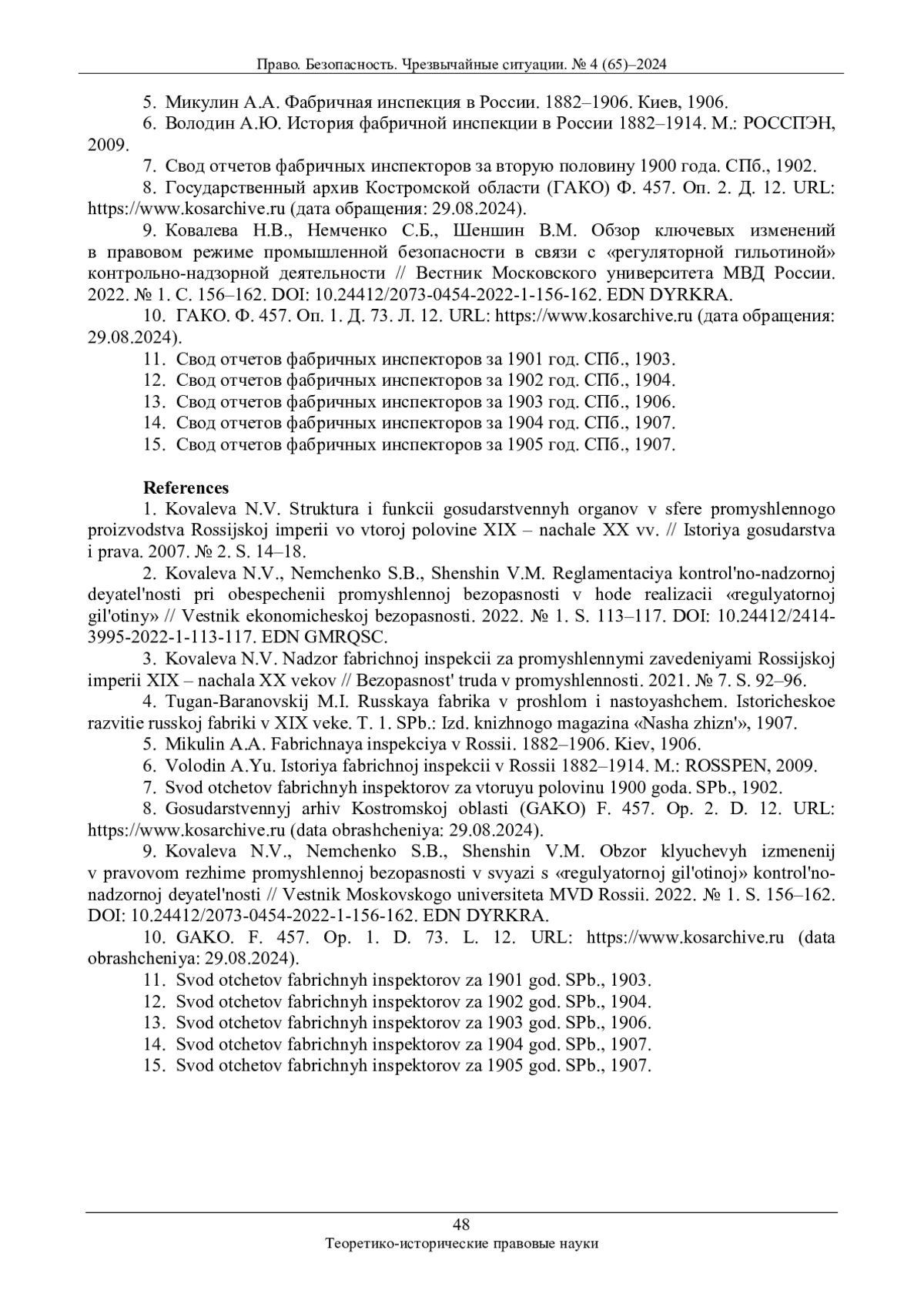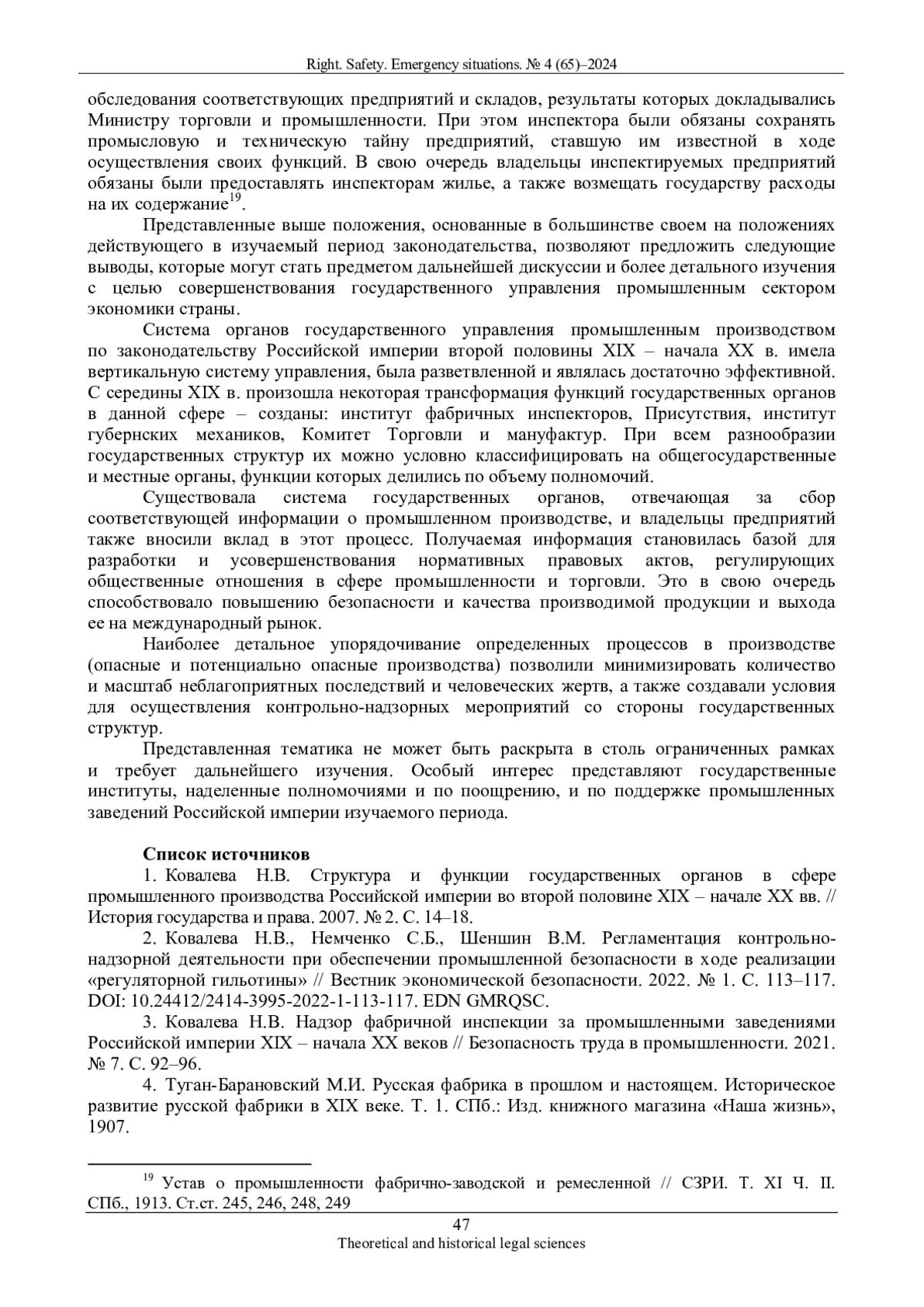 3. Ковалева Н.В. Надзор фабричной инспекции за промышленными заведениями Российской империи XIX - начала XX веков // Безопасность труда в промышленности. 2021. № 7. С. 92-96. EDN: WVLOZQ